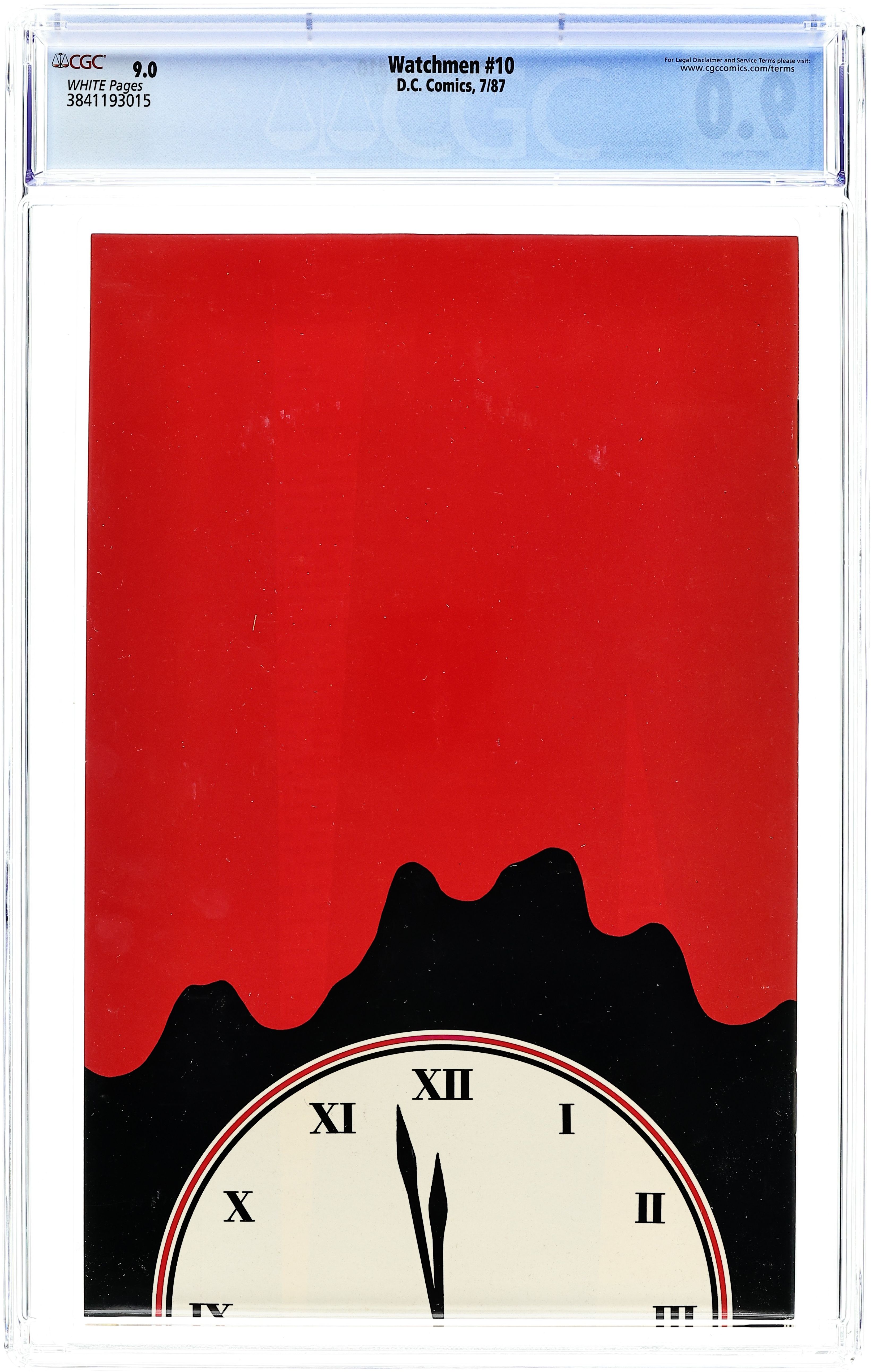 "Two riders were approaching". Part 10 of 12. Story by Alan Moore. Art and cover by Dave Gibbons. Rorschach and Night Owl continue their detective work and finally discover who is behind the conspiracy. This is not a good thing. Includes four page fictional text feature with a view of Adrian Veidt's scrapbook. 32 pages. Full color. No ads. Cover price $1.50.