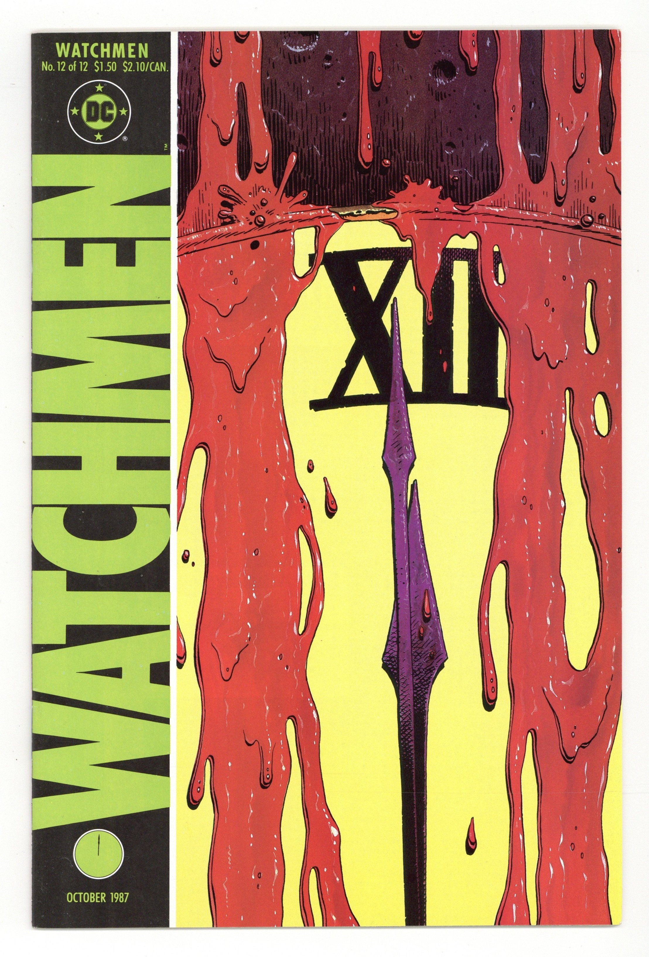"A strong and loving world". Part 12 of 12. Story by Alan Moore. Art and cover by Dave Gibbons. All plotlines converge as the fates of all the characters are revealed. The final chapter of maybe the greatest series in comics history. 32 pages. Full color. No ads. Cover price $1.50.