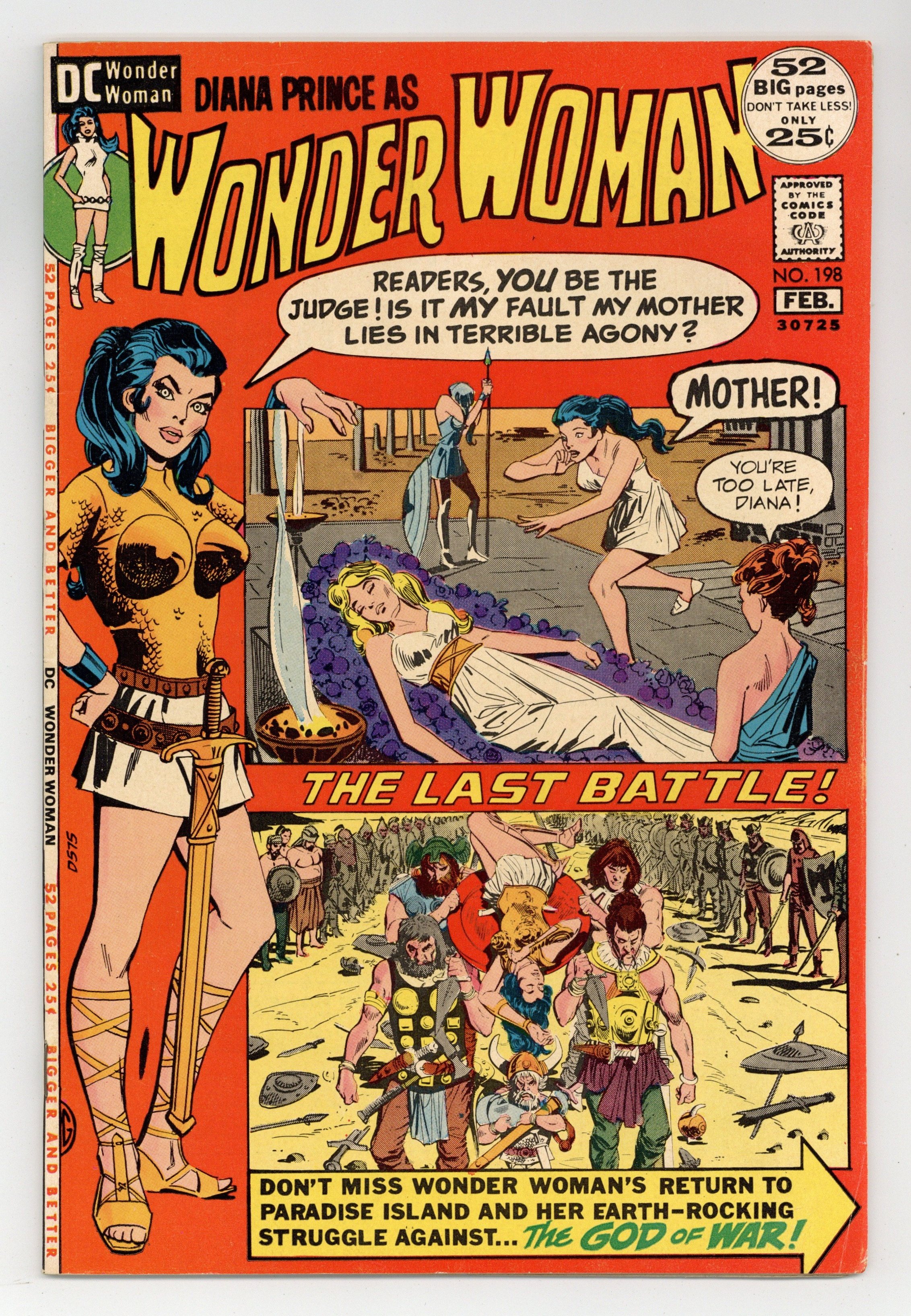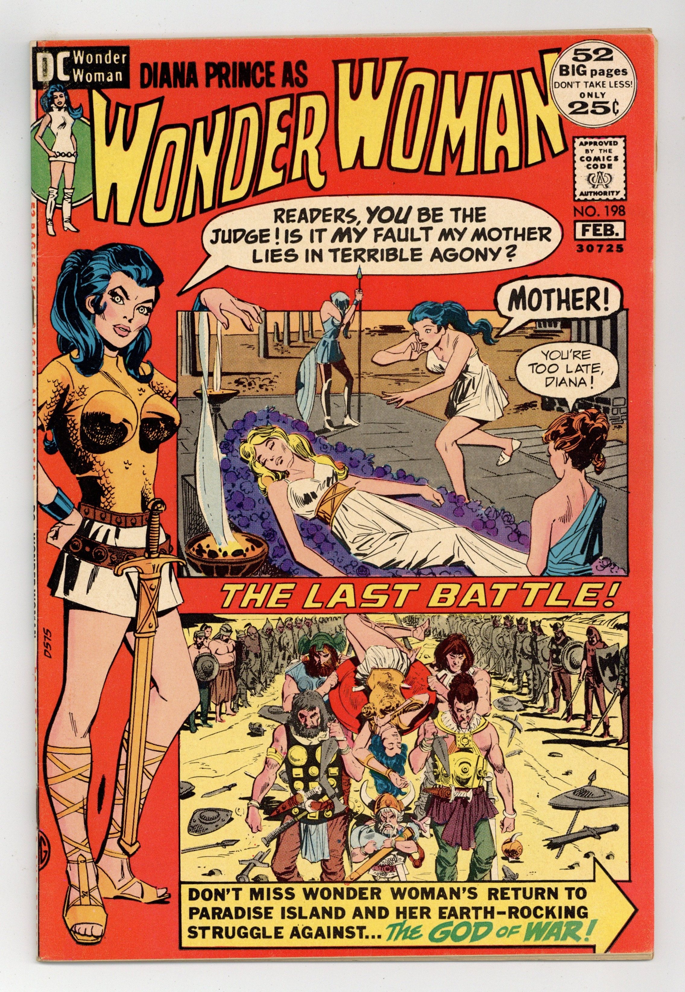 48-page giant. Cover by Dick Giordano. "Return to Paradise Island!", script and pencils by Mike Sekowsky, inks by Dick Giordano; A messenger brings Diana back to Paradise Island, which has been attacked by Ares, who seeks to wrest the secret of inter-dimensional travel from Hippolyta; Felled in the initial battle, Hippolyta lies in a coma, and so it falls to Diana to make the decision to fight on; Horribly outnumbered and battered by another battle, Diana must come up with a new plan to turn the tide; Diana crosses dimensions looking for legendary heroes to gather to repel Ares' hordes, but the heroes refuse her call, though the valkyries led by Brunhilde join the Amazons; But as the women fall in battle, the heroes arrive and rout Ares' warriors. Reprints Wonder Woman 183 and 184. 52 pages, Full Color. Cover price $0.25.