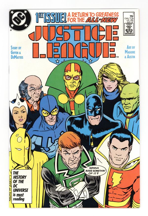 Direct Edition. When terrorists take the U.N. General Assembly hostage, Doctor Light (Kimiyo Hoshi) calls on the newly formed Justice League for help in "Born Again". Plot and breakdowns by Keith Giffen, script by Giffen and J.M. DeMatteis, pencils by Kevin Maguire, inks by Terry Austin. Batman, Guy Gardner, Black Canary, Mr. Miracle, Oberon, Captain Marvel, Martian Manhunter, Blue Beetle, Dr. Fate, Maxwell Lord. Maguire/Austin cover. Cover price $0.75.