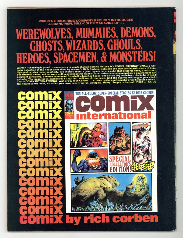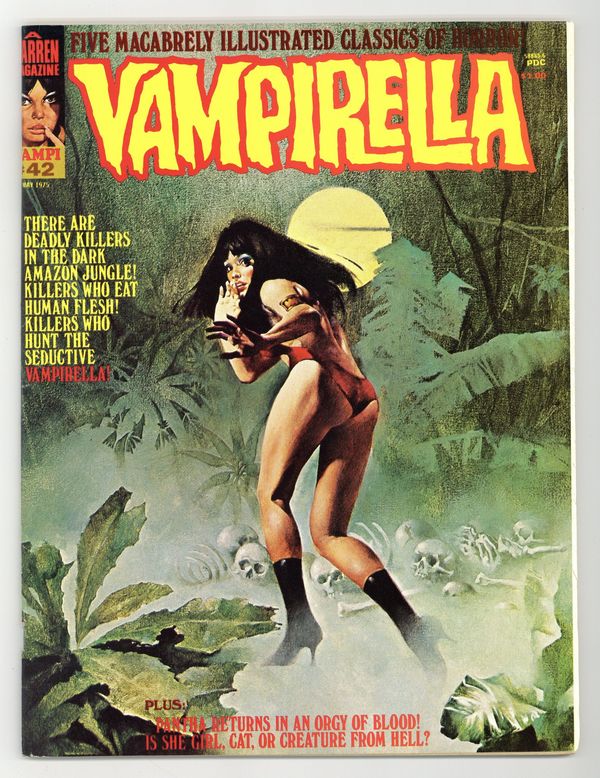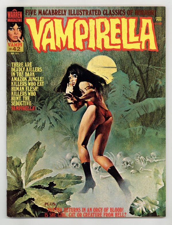 $25.00Stories in this issue include: "Mountain of Skulls" (starring Vampirella); "Around the Corner"; "Laugh, Clown, Laugh"; "Pantha"; and "The Whitfield Contract." Written by Gerry Boudreau, Fernando Fernandez, Shelly Leferman, and Budd Lewis. Art by Auraleon, Fernando Fernandez, Luis Garcia, Jose Gonzalez, and Esteban Maroto. Includes article on how to letter comics and a feature on the 1974 Warren Awards. Cover art by Enrich Torres. Cover price $1.00.