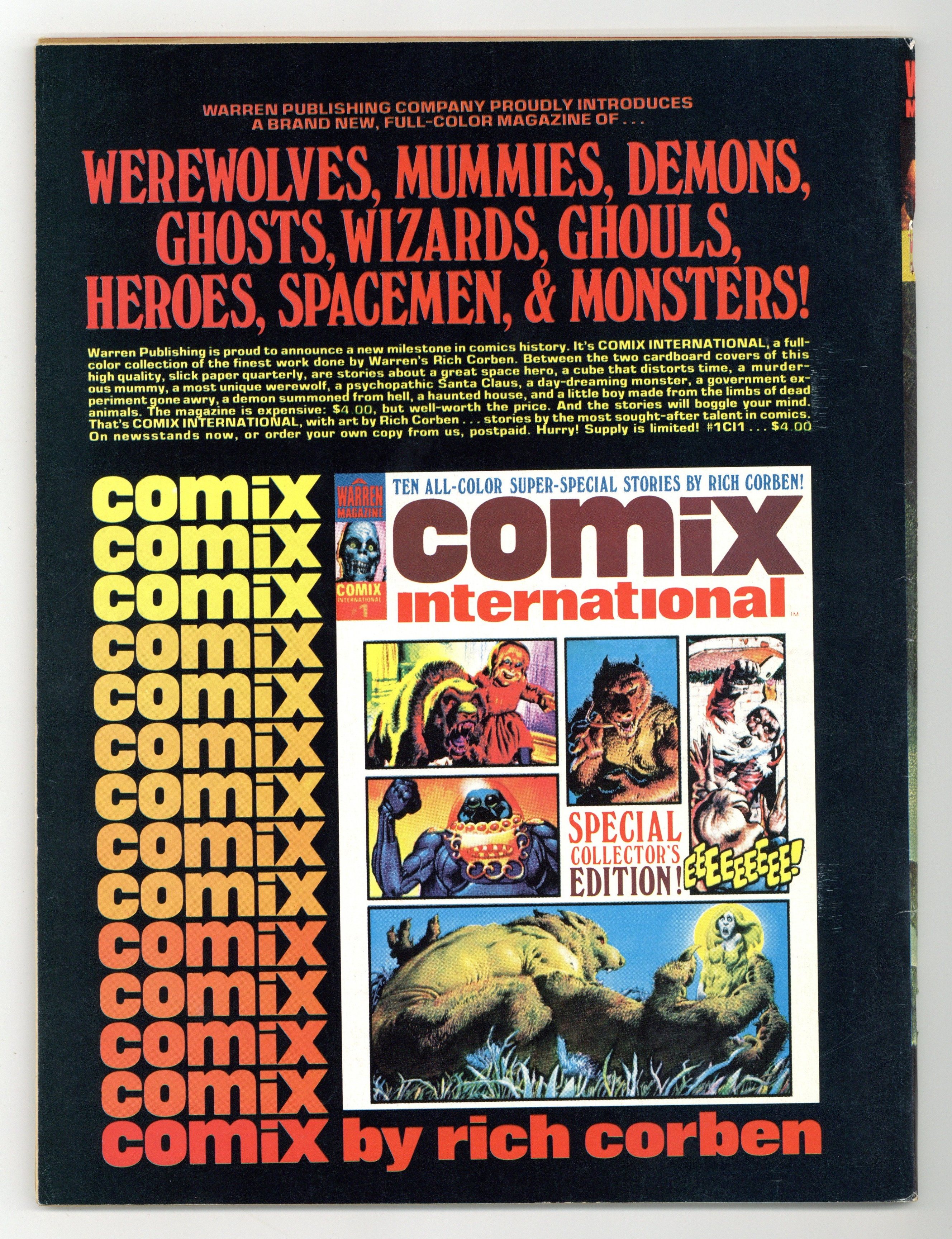 Stories in this issue include: "Mountain of Skulls" (starring Vampirella); "Around the Corner"; "Laugh, Clown, Laugh"; "Pantha"; and "The Whitfield Contract." Written by Gerry Boudreau, Fernando Fernandez, Shelly Leferman, and Budd Lewis. Art by Auraleon, Fernando Fernandez, Luis Garcia, Jose Gonzalez, and Esteban Maroto. Includes article on how to letter comics and a feature on the 1974 Warren Awards. Cover art by Enrich Torres. Cover price $1.00.