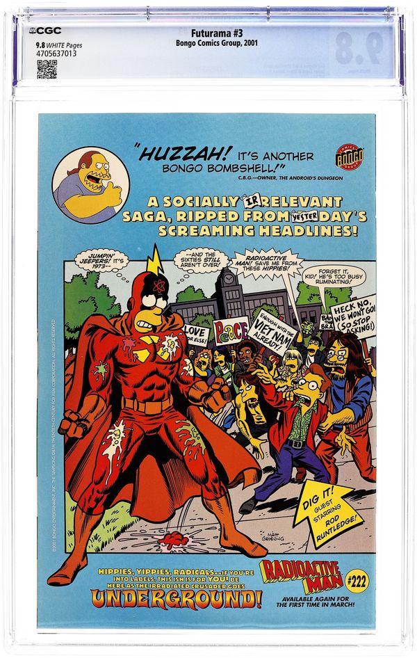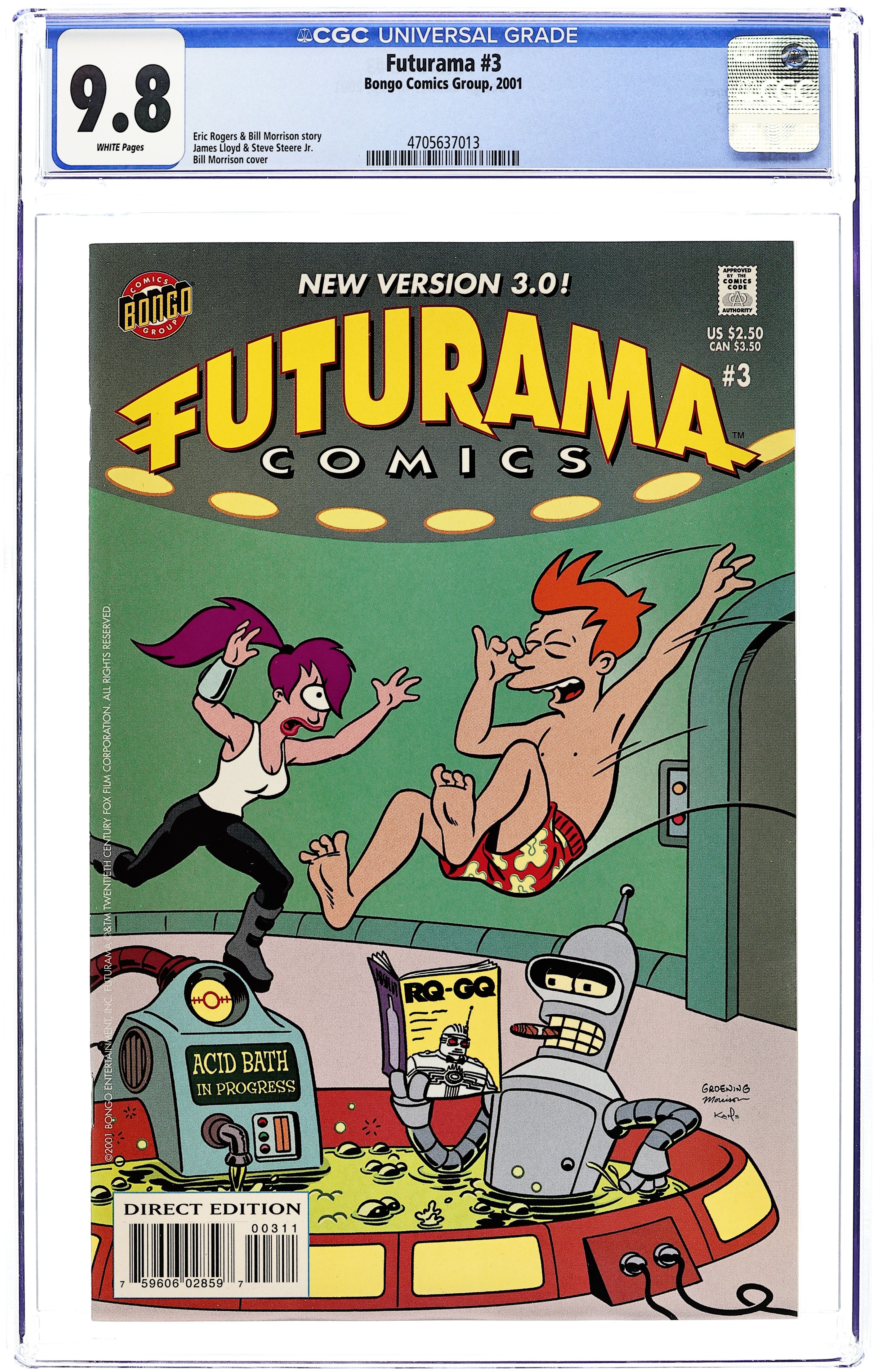 Direct Edition. Story by Eric Rogers and Bill Morrison. Art by James Lloyd and Steve Steere Jr.. Cover by Bill Morrison. Leela gets caught up in the newest collectible craze of the future, the Needy Newbie. However, when Amy's mom, Inez Wong, turns her newfound hobby into a competition for the ultimate collection, Leela, Fry, and Zoidberg uncover an insidious plot that threatens all humanity... as well as the top market value of their most precious possession ? their lives!FC, 32pg Cover price $2.50.