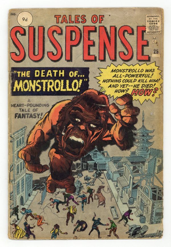 UK edition. Identical to US edition, but has 9d cover price. Last 10-cent issue. Cover pencils by Jack Kirby, inks by George Klein. "The Death of Monstrollo," pencils by Jack Kirby, inks by Dick Ayers; A movie producer's next film is a sci-fi picture featuring a giant robotic monster; Bad press convinces him to abandon the project but just as he's about to disassemble the robot, an alien invasion fleet lands; He sends the robot lumbering towards them and they ineffectively fire their nerve weapons at it. "The Heat's On," art by Don Heck; When a young boy builds a fan to help his family get through a heat wave it brings down the flying saucer that caused the heat. "The Unseen," pencils by Jack Kirby, inks by George Klein; A scientist is contacted by a communist agent who offers him a million dollars for research into an invisibility ray; The man's greed makes him accept treason and he succeeds, but he finds that after testing the ray upon himself, he has become intangible as well and has no way of turning on the switch of the antidote ray. "The Hidden Face," script by Stan Lee, art by Steve Ditko; An alien bigot attempts to preach hate by hiding his face under a hood; When he assaults one of the people he is defaming he flees the police to escape capture. "The Enchanted Paint," art by Paul Reinman; A greedy prince marries a dowager queen; He tries to use her sleepwalking to cause her death, but the portrait of her husband calls out to warn her, and ghostly hands push the prince to his death. 36 pgs., full color.