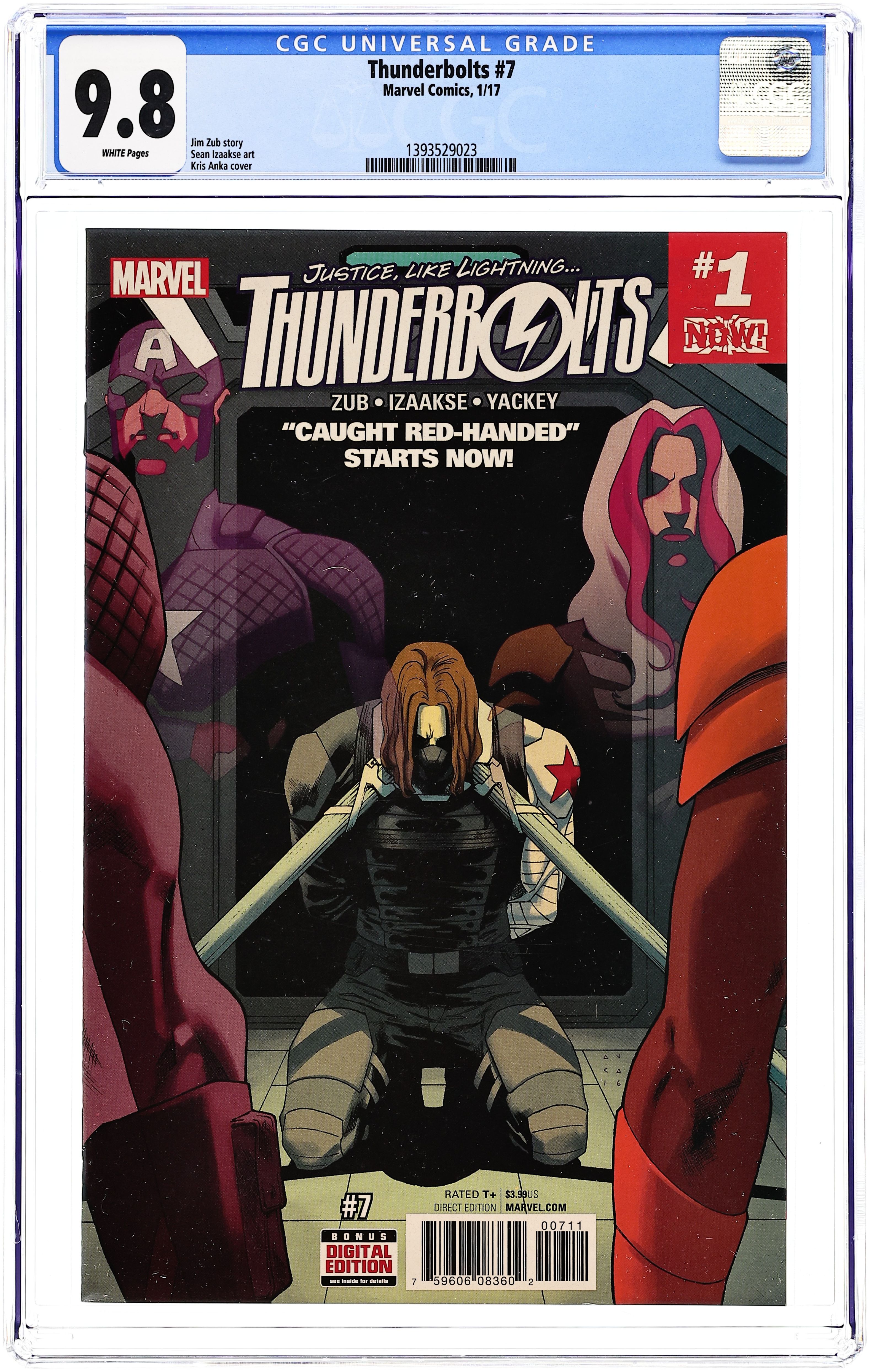 Caught Red-Handed: Part 1 - Written by Jim Zub. Art by Sean Izaakse. Cover by Kris Anka. 'CAUGHT RED-HANDED' STARTS NOW! Operate in the shadows long enough, someone is going to shine a light on you. Bucky didn't think that person would be his best friend, Steve Rogers. Captured and separated from his team, Bucky is on his own. Where do his loyalties lie? Steve wants to know. Only Steve has secrets of his own. Plus, an original Thunderbolt returns! How will Songbird react to the reunion of her former team? 28 pages, full color. Rated T+ Cover price $3.99.