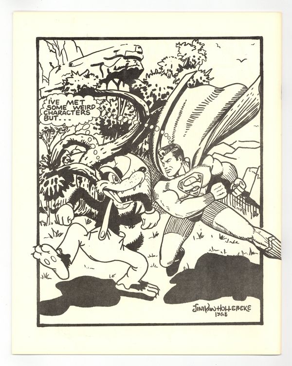 Published 1968 (est.) by No publisher listed/fanzine.$18.00Cover by Buddy Saunders, owner of Mycomicshop and Lone Star Comics. Buddy's cover stars the Timely Golden Age superhero The Vision. Published by Chuck Wooley in 1968. Larry Herndon's "Fandom's Library" continues, as does "A Listing Of Whitman Material" by Dale Manesis. Dale's installment is a very detailed alphabetical list of the Whitman BLBs, from Dick Tracy 1454 to Little Orphan Annie 1403. There are a lot of other features, including a list of current fanzines, a Panelology Quiz, a Krazy Kat article, and Justice Society portraits by Bill Wilson. For many, the highlight is three pages of photos from the 1968 Dallas SW convention. Pictured are Ken Finnerty, Larry and Irving Bigman, Chuck Wooley, Fritz Leiber, Larry Herndon, Tom Reamy, Gary Acord, Caz, Boyd and Dee, Paul McSpadden, Bill Wallace, and G. B. Love. "For Sale" ad highlights find Buddy Saunders offering Avengers 1 for $3.25, Spider-Man 13 for $1.25, Marvel Super Heroes 13 for 50c, and X-Men 4 at $1. The back cover is a humorous full page pin-up of Superman meeting the Big Bad Wolf, by Hollebeke. 8.5-in. x 11-in. 28 pages B&W. Cover price $0.50. Cover price $0.50.