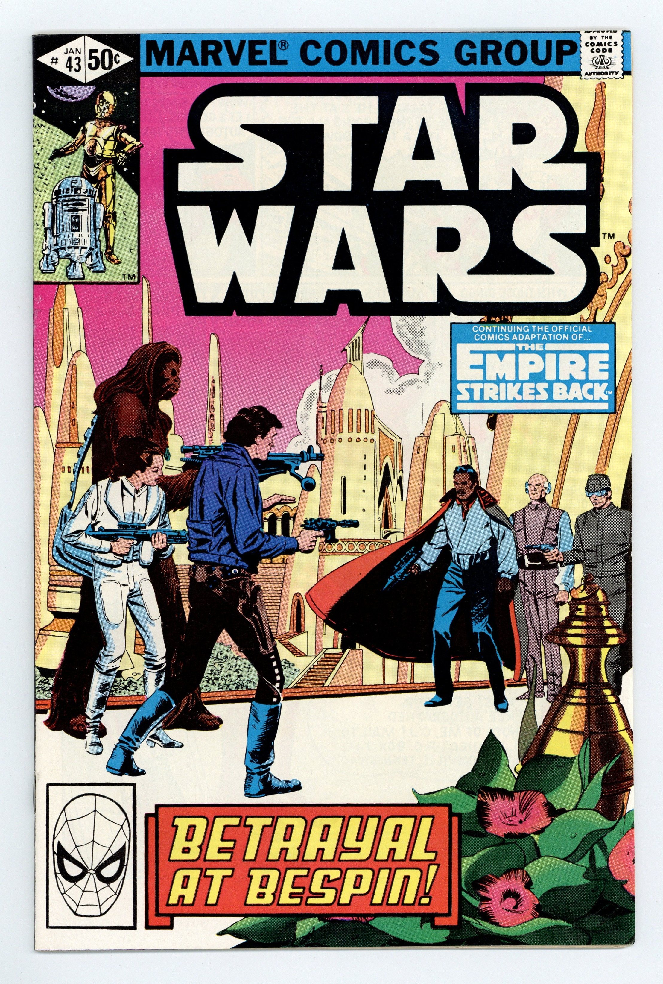Direct Edition. The Empire Strikes Back: Part 5 of 6. "Betrayal at Bespin!" Based on the screenplay by George Lucas. Adapted by Archie Goodwin. Art by Al Williamson and Carlos Garzon. After their narrow escape from the pursuing Empire Fleet, the crew of the Millennium Falcon sets down on the Cloud City of Bespin for repairs. Lando Calrissian, proprietor of the floating facility, is an old friend of Han's. But he is an old friend with some dark secrets. Meanwhile, Luke's training under the tutelage of the Jedi Master, Yoda, is cut short when the young padawan senses that his friends are in great danger. Against Yoda's better judgement Luke races to Cloud City and the stage is set for the greatest battle between the forces of good and evil. Includes 5 pin-ups by Terry Austin, Michael Golden, John Byrne, Marie Severin, and Frank Miller. Cover price $0.50.
