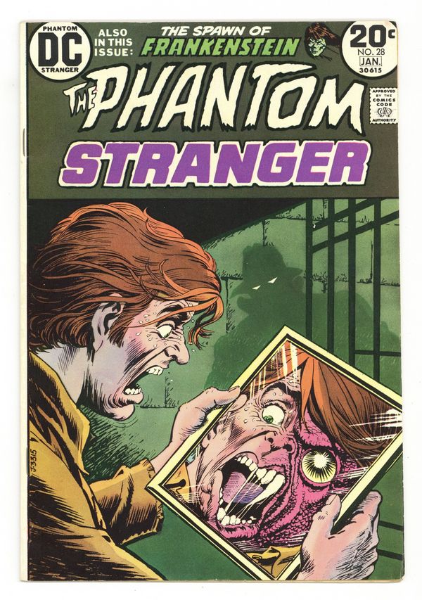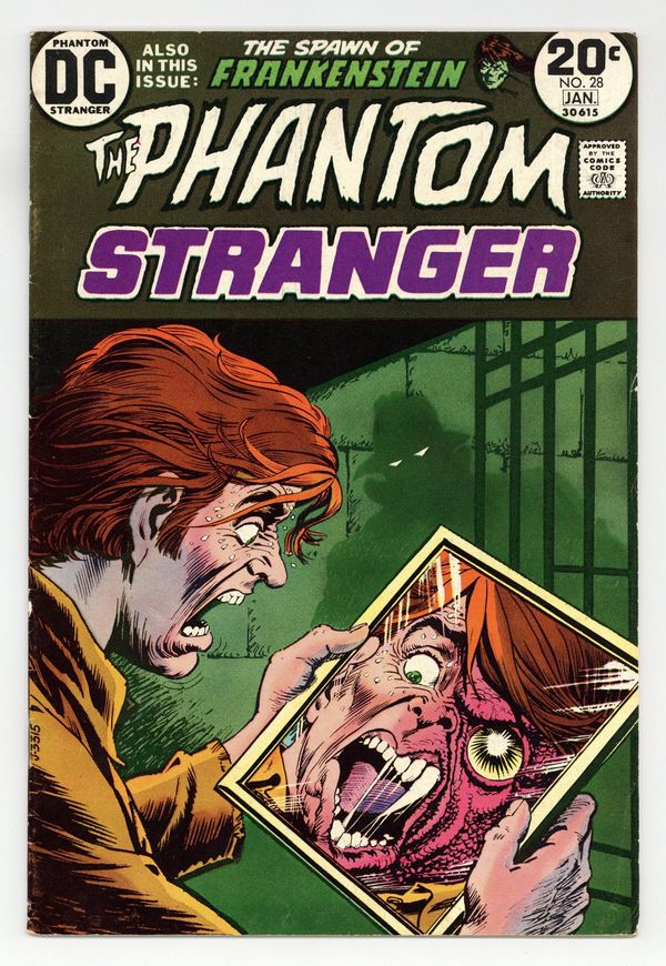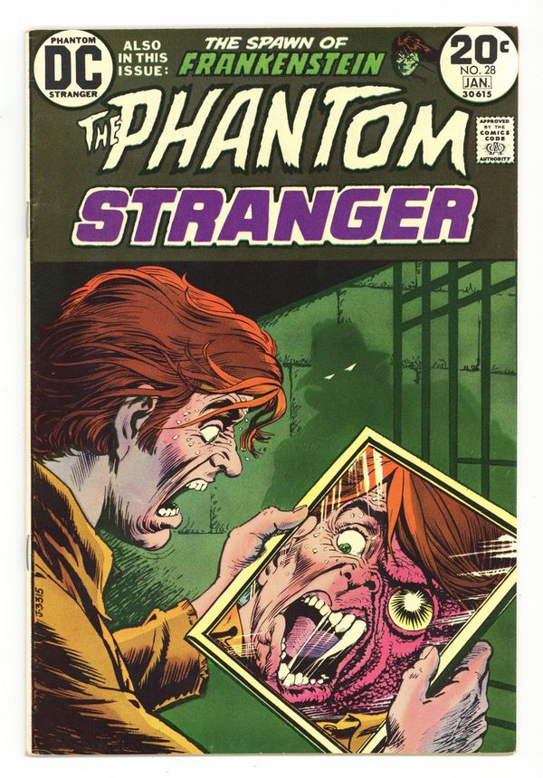 $11.50Cover art by Nick Cardy. "The Counterfeit Madman!", script by Arnold Drake, art by Gerry Talaoc; When Willie Limmick apparently pulls out a gun and holds an entire plane hostage for a ransom due to his split personality known as Joseph Gantz; However, the Phantom Strangers intervention ends with Willie being taken into police custody; The jury presiding over Willie's case believes that the man suffers from a split personality; The Phantom Stranger warns them not to be so quick to believe his story. "Night of the Snake God," script by Steve Skeates, art by Bernard Baily; The Spawn of Frankenstein is trying to save the life of a woman about to be sacrificed by a cult that worships a snake god; However, the jilted lover of the woman wants to kill the Spawn for interrupting his attempt for forcibly have his way with the woman; The monster disarms the man and saves the woman before she can be sacrificed by the cult; However in fleeing, the limbering monster accidentally kills her when his awkward limbering causes her to break her neck when her head strikes a tree. 36 pgs., full color. Cover price $0.20.