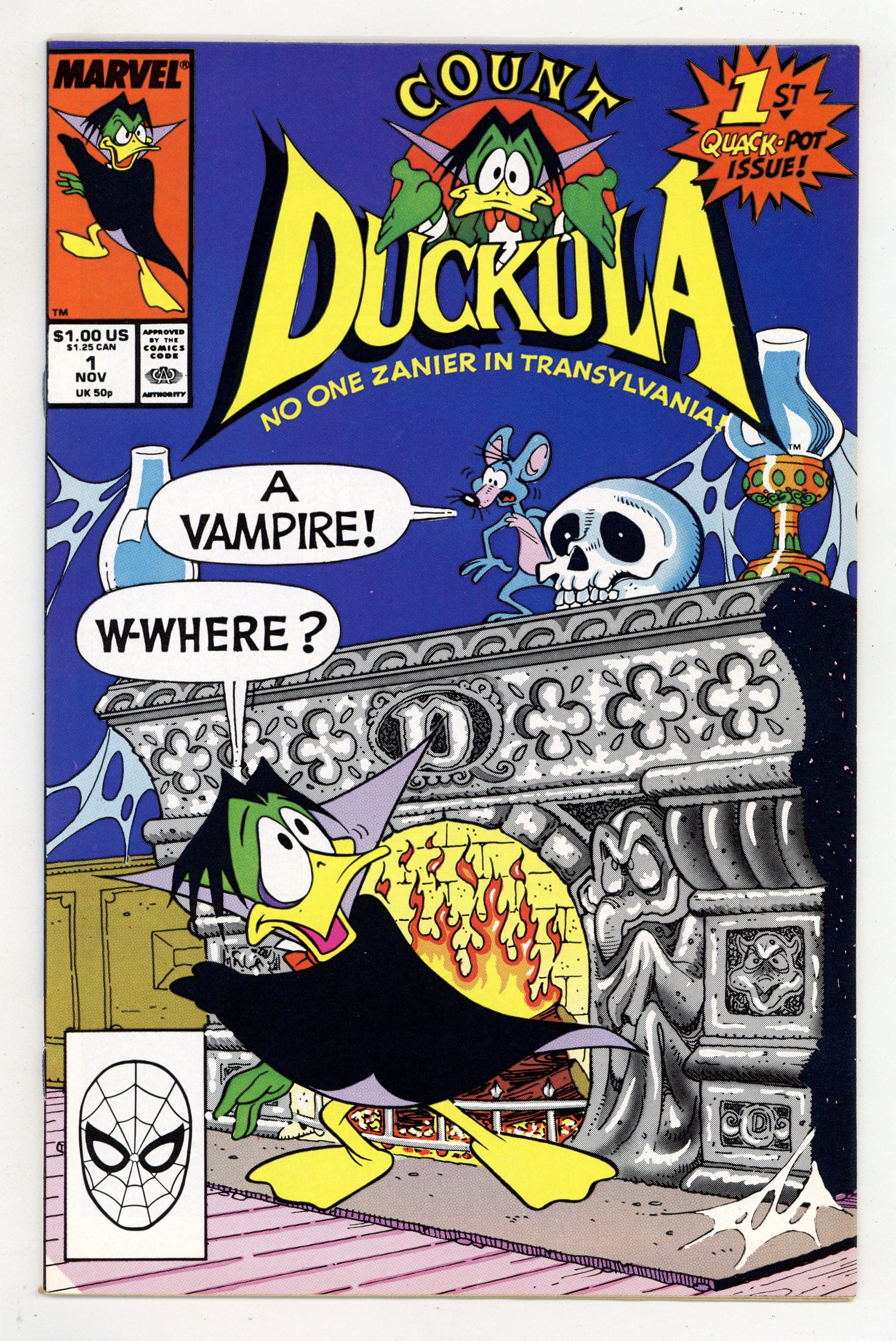 Comic book version of the animated series which originally aired in the late 1980s. Igor creates a new vampire to roam the halls of Castle Duckula but he messes up and creates a vegetarian vampire, Count Duckula who would rather eat salad instead of blood and play some music. But Dr. Von Goosewing, the world's greatest vampire hunter, is on his trail in "A Minor Fowl-Up." And then Count Duckula decides to try to become a movie star and travels to Hollywood to do so in "Lights! Camera! Traction!" Scripts by Michael Gallagher and art by Warren Kremer. Cover price $1.00.