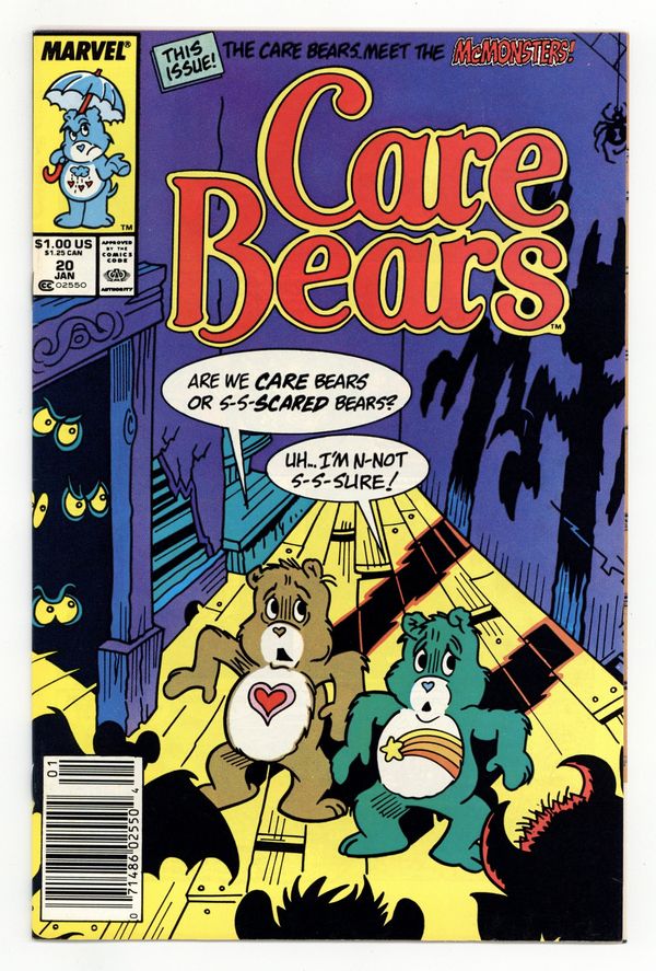 Published Jan 1989 by Marvel/Star Comics.$21.00Join the Care Bears in their magical home, the incredible land of Care-A-Lot. Cover pencils by Howie Post, inks by Roberta Edelma. Cocoa Pebbles ad with the Flintstones. Meet The McMonsters Or Learning Fright From Wrong!, script by Angelo DeCesare, pencils by Howie Post, inks by Roberta Edelman; The Care Bears meet Ick & Eek McMonster, two children who run away from home because they don't want to follow their parents in scaring people. Jolly Rancher Stix ad with art by Don Martin. The Space Saver Or This Little Piggy Went to Martian, script by Angelo DeCesare, pencils by Howie Post, inks by Jacqueline Roettcher; The Care Bears encounter an alien who steals children's piggy bank money, in the belief that it will make him liked if he is rich. 36 pgs., full color. $1.00. Cover price $1.00.