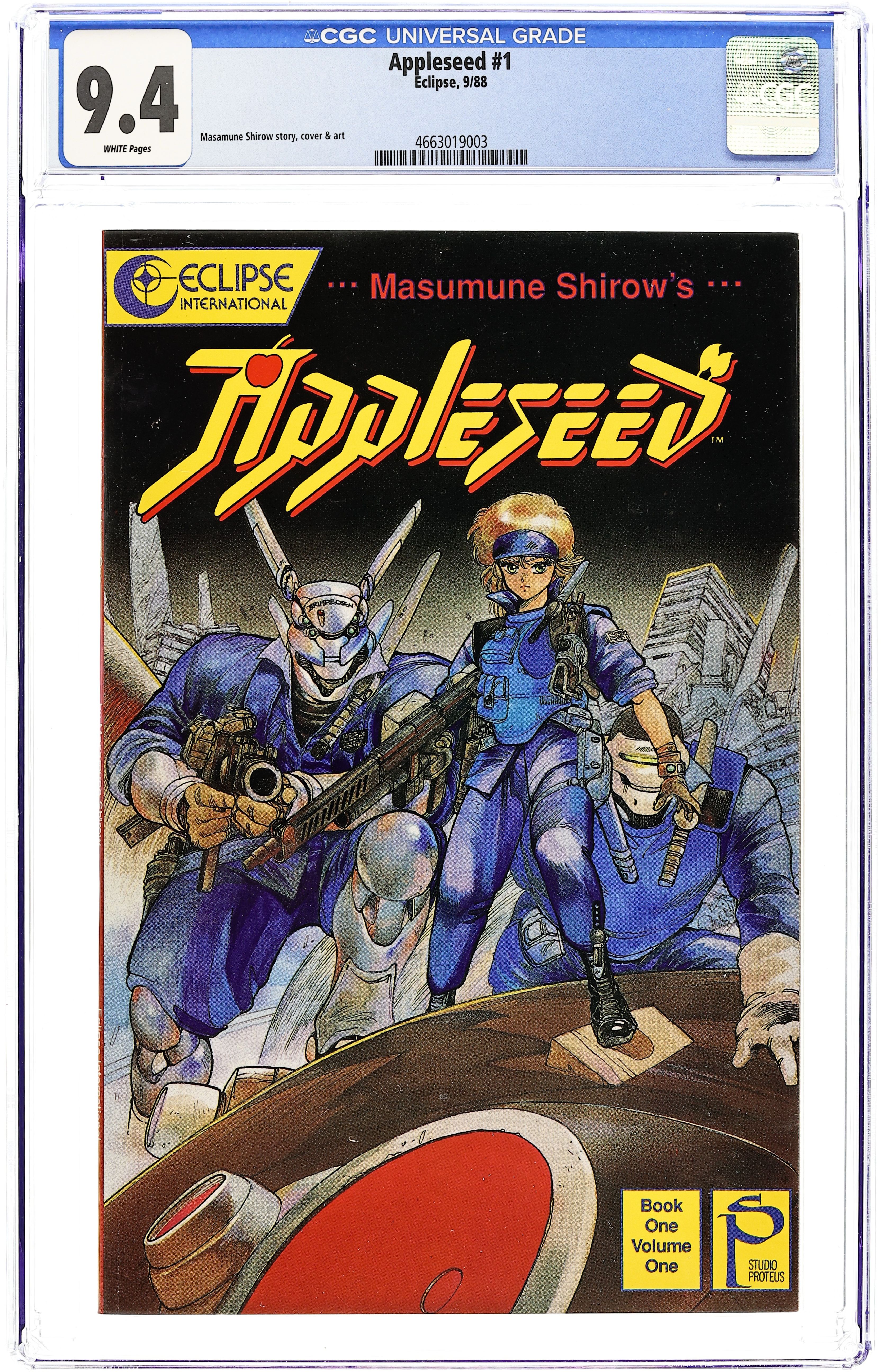 Story & art: Masamune Shirow. Beginning Eclipse's serialization of Japan's first mega-successful graphic novel! With new material still being done in Japan, Appleseed has earned Masamune Shirow the Japanese equivalent of our Hugo award, and Shirow's Appleseed artwork today hangs in a major display at the Osaka Art Gallery! Escaping nuclear destruction, Earth has nevertheless been laid waste by the conventional/biochemical conflagration that was World War Three. Two survivors, after years of seclusion, return to looking for the remnants of humanity. What they least expect to find is humanity looking for them! Deunan and her cyborg mentor, Briareos, must fight off a full-scale tank assault and learn the purpose of their assailants! 48 pg. B&W Classic Format. Cover price $2.50.