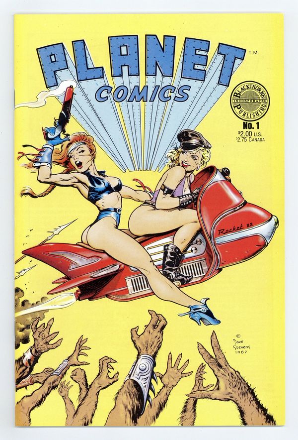 Stories by Bruce Jones. Art by Adrian Moro, Ken Hooper and Rico Rival. Cover by Dave Stevens. Blackthorne Publishing resurrects the original Planet Comics title published by Fiction House in the 1940s-50s. Writer Bruce Jones even revives Matt Baker's gypsy adventurer, Flamingo, and original Planet Comics heroes Bowman and Lyssa, Queen of the Lost World, battling the reptilian Voltamen to free Earth. Featuring a great cover by beloved good-girl artist (and Rocketeer creator) Dave Stevens. Hunt Bowman in The Lost World; Flamingo; Secret Circle. 32 pages, Full Color. Cover price $2.00.