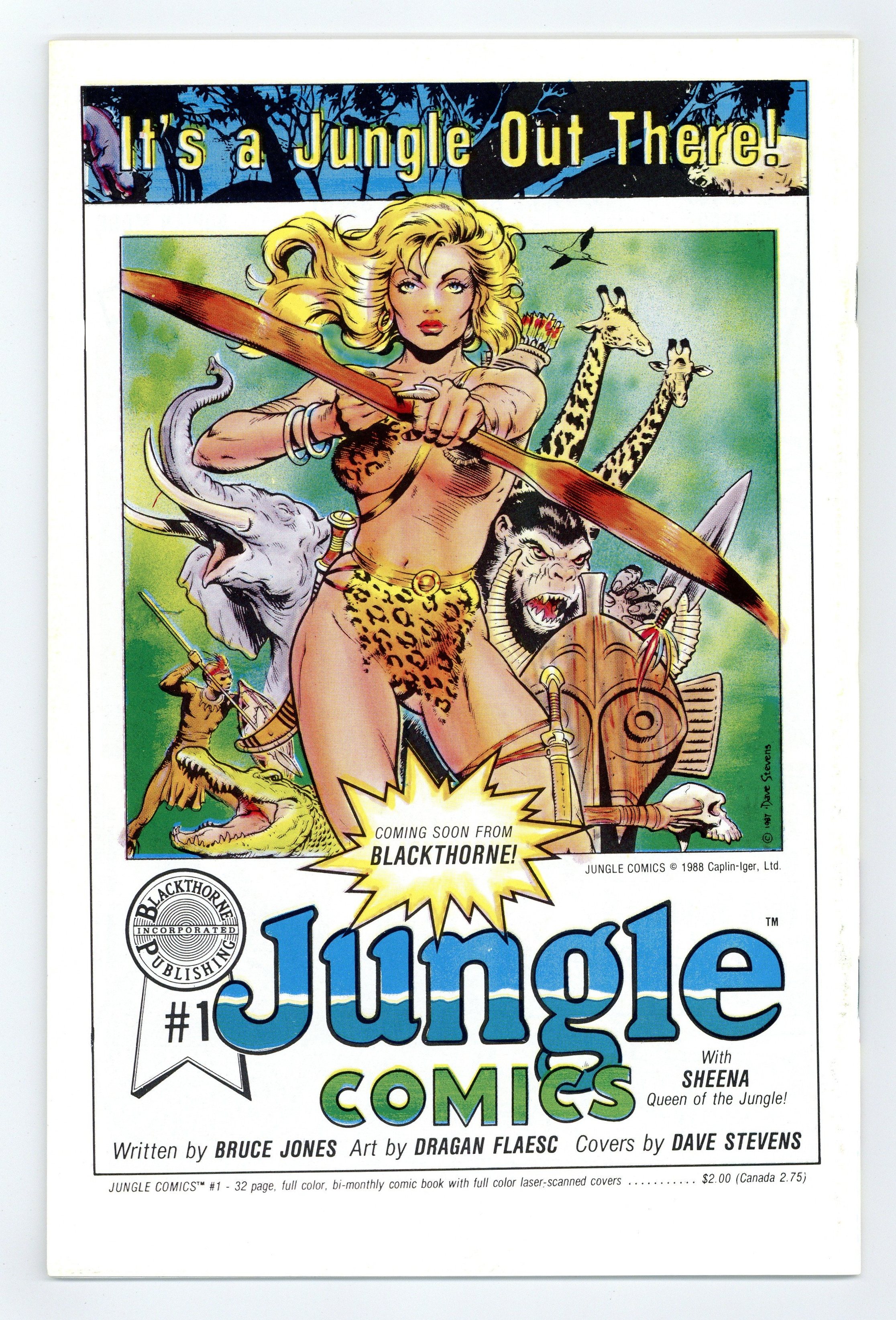 Published Apr 1988 by Blackthorne.$280.00Stories by Bruce Jones. Art by Adrian Moro, Ken Hooper and Rico Rival. Cover by Dave Stevens. Blackthorne Publishing resurrects the original Planet Comics title published by Fiction House in the 1940s-50s. Writer Bruce Jones even revives Matt Baker's gypsy adventurer, Flamingo, and original Planet Comics heroes Bowman and Lyssa, Queen of the Lost World, battling the reptilian Voltamen to free Earth. Featuring a great cover by beloved good-girl artist (and Rocketeer creator) Dave Stevens. Hunt Bowman in The Lost World; Flamingo; Secret Circle. 32 pages, Full Color. Cover price $2.00.