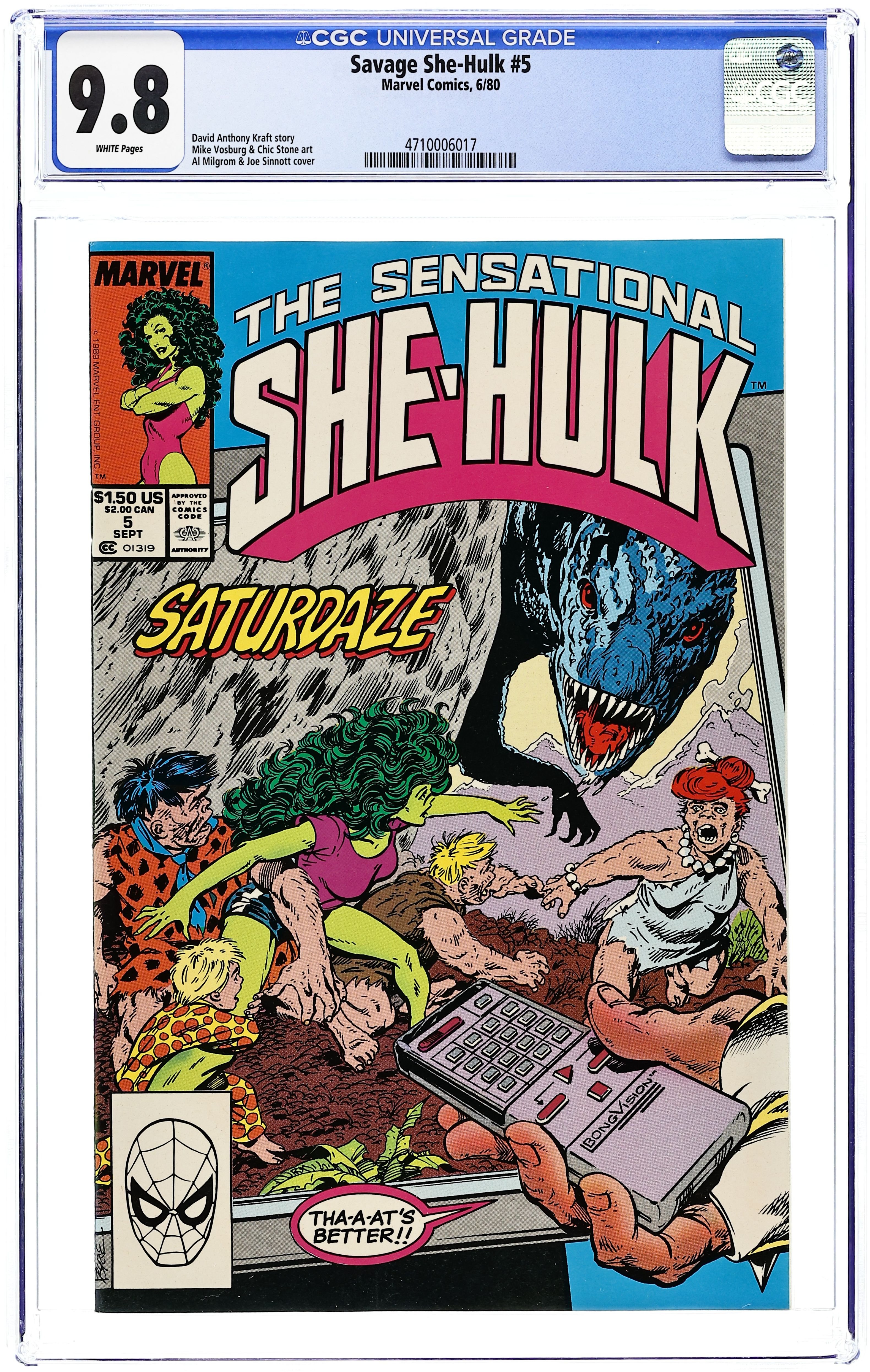 Cover art by John Byrne. The Doctor Is In, script and pencils by John Byrne, inks by Bob Wiacek; She-Hulk finds herself in a world of cartoon characters and dinosaurs. 36 pgs. $1.50. Cover price $1.50.