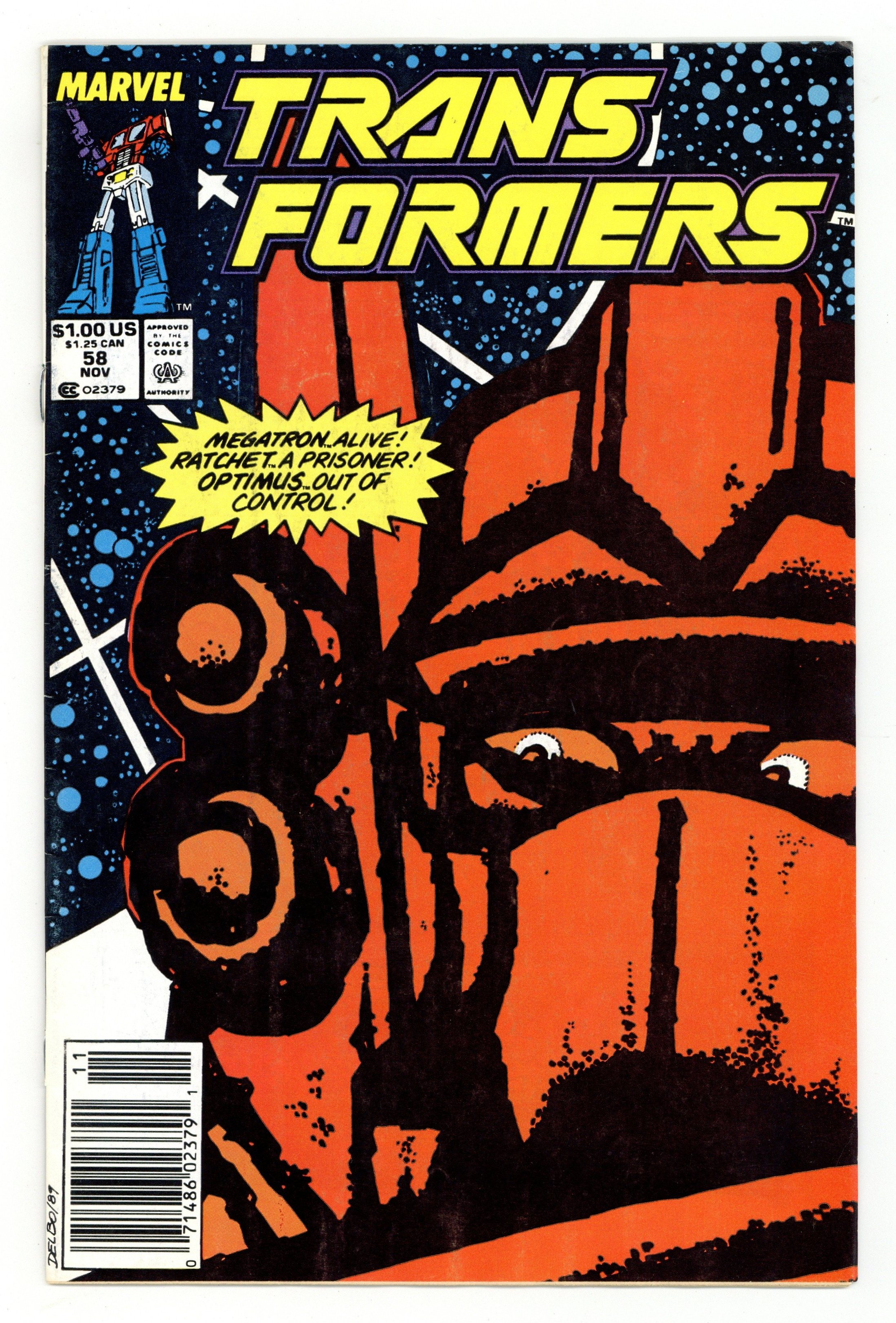 Starts Feb 2 "All the Familiar Faces!" Megatron...alive! Ratchet...a prisoner! Optimus...out of control! Written by Simon Furman, with art by Jose Delbo and Dave Hunt. Cover by Jose Delbo. Cover price $1.00.