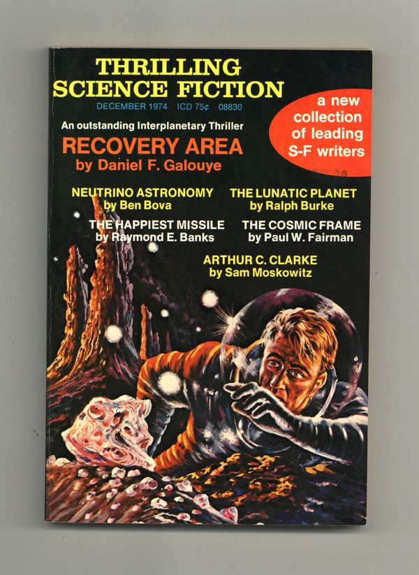 Published Dec 1974 by Ultimate Publishing Company.$36.00Not numbered. December 1974. Cover by Johnny Bruck. Science fiction reprints from Daniel F. Galouye, Ralph Burke, Ben Bova, Raymond E. Banks, Paul W. Fairman, and Sam Moskowitz. Illustrations by Frank Kramer, Virgil Finlay, Leo Summers. 5 1/4-in. x 7 1/2-in.; black and white; 130 pages. Cover price $0.75.