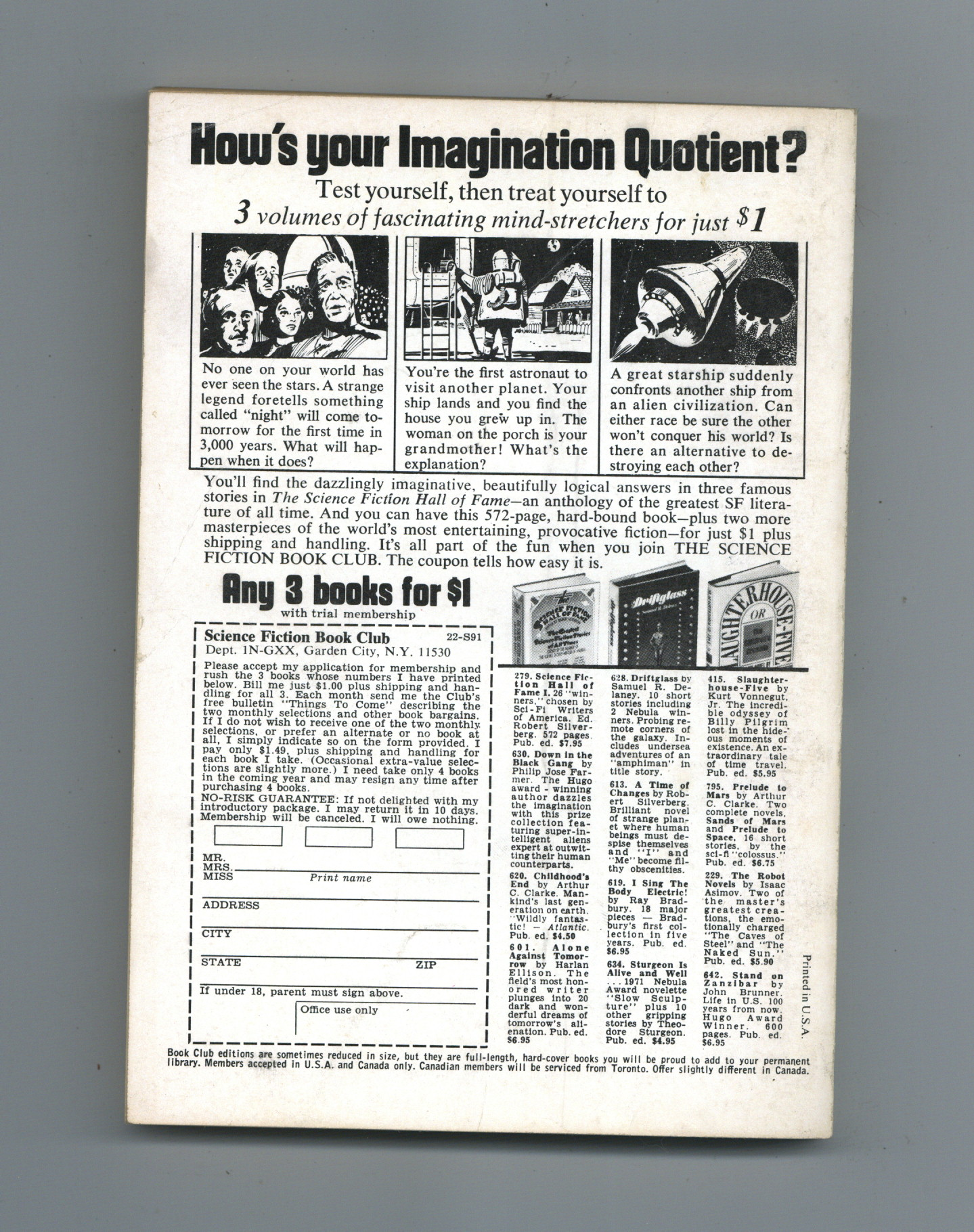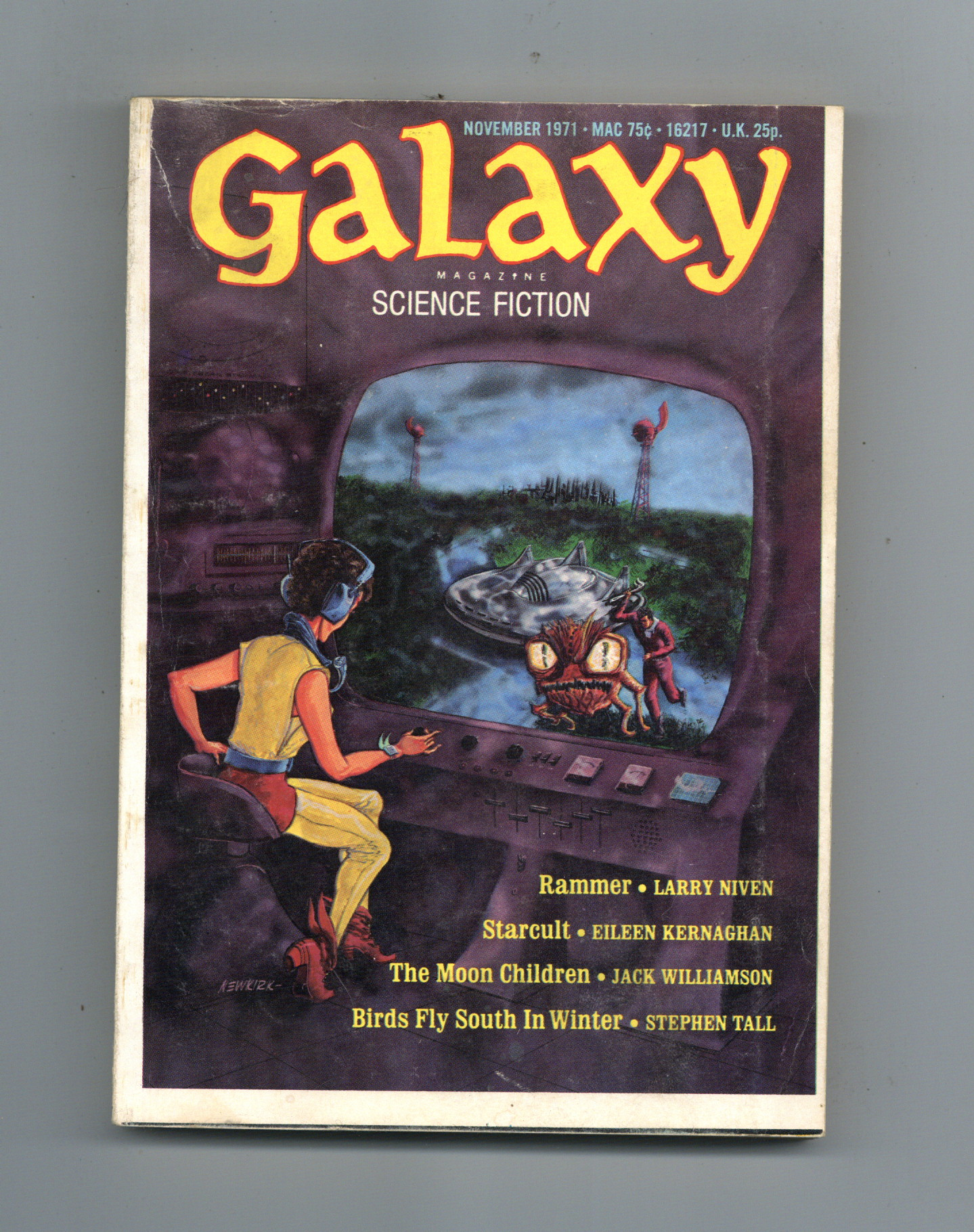 Published Nov 1971 by Galaxy Publications.$3.20November 1971. Cover by Claude Newkirk. Science fiction stories by Stephen Tall, Larry Niven, Eileen Kernaghan, Jack Williamson, A. Lentini, John Taylor, R. A. Lafferty. Illustrations by Gaughan, Newkirk. 5-1/4-in. x 7-1/4-in.; b&w text with spot illustrations; 192 newsprint pages. Cover price $0.75.