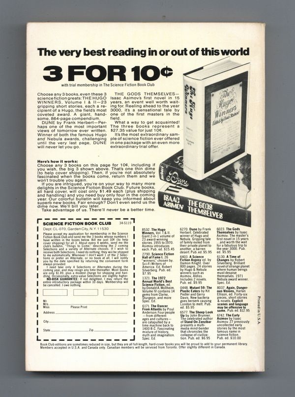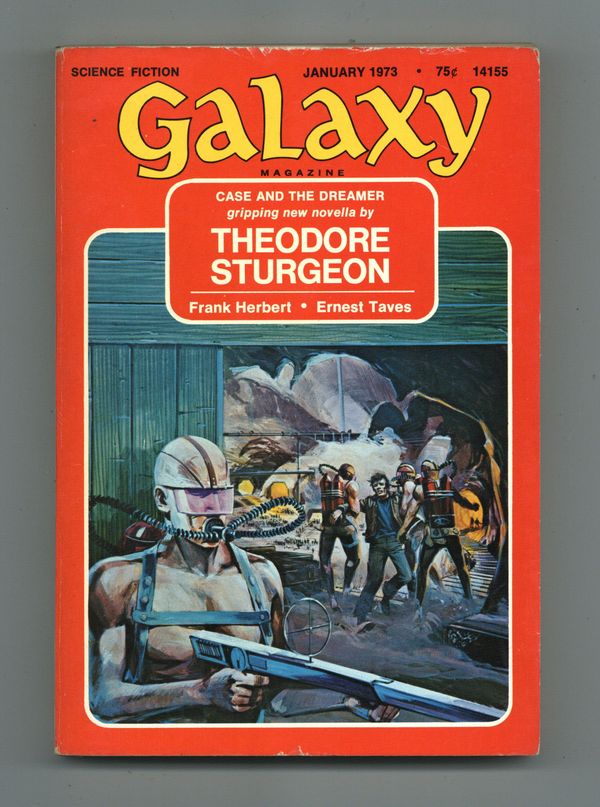 Published Jan 1973 by Galaxy Publications.$6.49January-February 1973. Cover by Brian Boyle. Science fiction stories by Theodore Sturgeon, Ernest Taves, Frank Herbert, Gene Wolfe, T. J. Gordon. Illustrations by Gaughan, Adkins. 5-1/4-in. x 7-1/4-in.; b&w text with spot illustrations; 176 newsprint pages. Cover price $0.75.