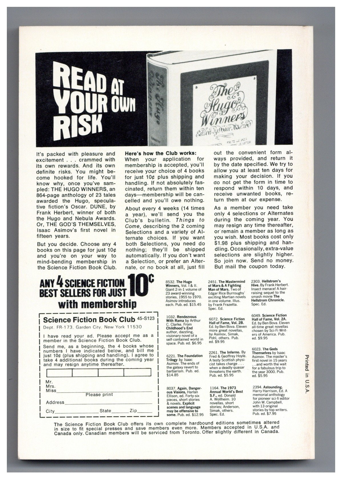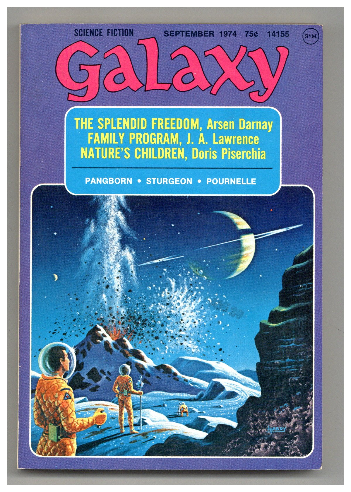 Published Sep 1974 by Galaxy Publications.$12.00Cover by David Hardy. Science fiction stories by Arsen Darnay, J. A. Lawrence, Doris Piserchia, Rex & Elizabeth Levie, Thomas Wylde, Mary Soderstrom, Edgar Pangborn. Illustrations by Stephen Fabian, Freff, Jack Gaughan, Wendy Pini. 5-1/4-in. x 7-1/4-in.; b&w text with spot illustrations; 176 newsprint pages. Cover price $0.75.