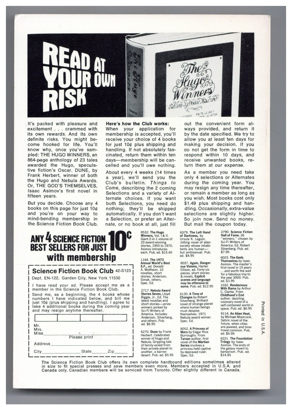Cover by Jack Gaughan. Science fiction stories by John Brunner, Christopher Priest, Michael G. Coney, Cynthia Bunn, Doris Piserchia, David Penny, Larry Eisenberg. Illustrations by Jack Gaughan. 5-1/4-in. x 7-1/4-in.; b&w text with spot illustrations; 176 newsprint pages. Cover price $0.75.