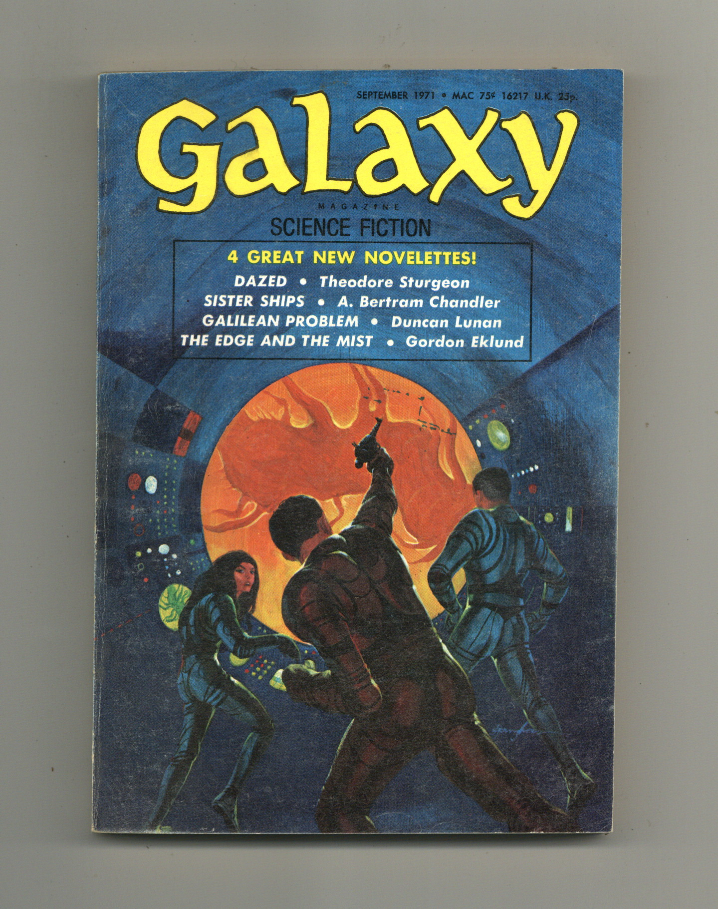 Published Sep 1971 by Galaxy Publications.$8.49September-October 1971. Cover by Jack Gaughan. Science fiction stories by Gordon Eklund, Theodore Sturgeon, A. Bertram Chandler, Duncan Lunan, Jack Williamson, Alan Dean Foster. Illustrations by Gaughan. 5-1/4-in. x 7-1/4-in.; b&w text with spot illustrations; 176 newsprint pages. Cover price $0.75.
