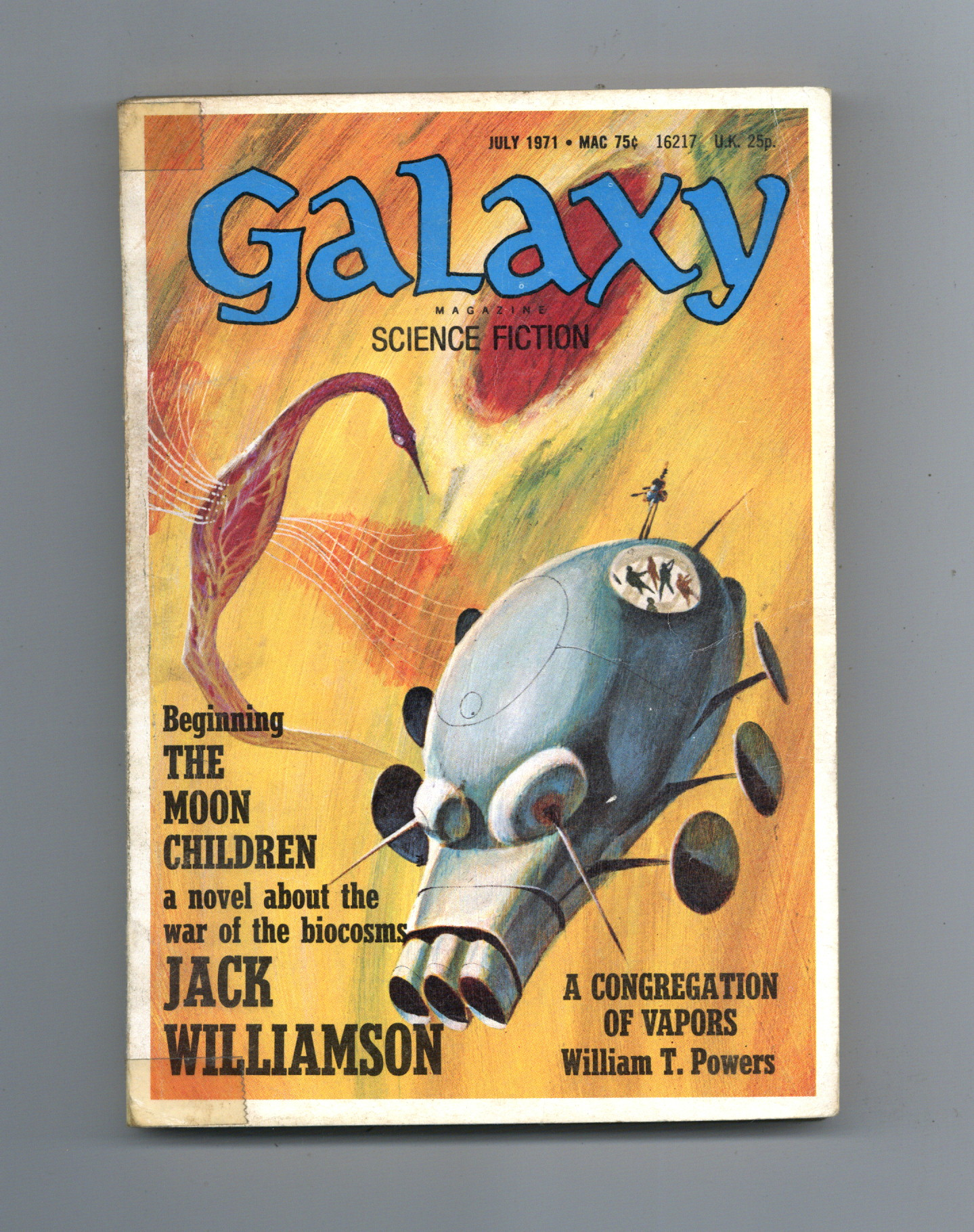 Published Jul 1971 by Galaxy Publications.$3.20July-August 1971. Cover by Jack Gaughan. Science fiction stories by Robert Silverberg, Jack Williamson, William T. Flowers, R. A. Lafferty, Ernest Hill, J. K. Swearingen, Larry Eisenberg. Illustrations by Gaughan. 5-1/4-in. x 7-1/4-in.; b&w text with spot illustrations; 176 newsprint pages. Cover price $0.75.