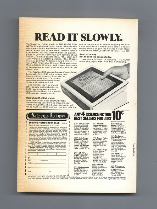 March-April 1973. Volume 21, No. 10 (Whole No. 165). Cover by Brian Boyle. Science fiction stories by Frederik Pohl, Jack Williamson, Michael G. Coney, Colin Kapp, David Magil, Edward Wellen. 5.25-in. x 7.5-in.; black and white; 176 newsprint pages. Cover price $0.75.