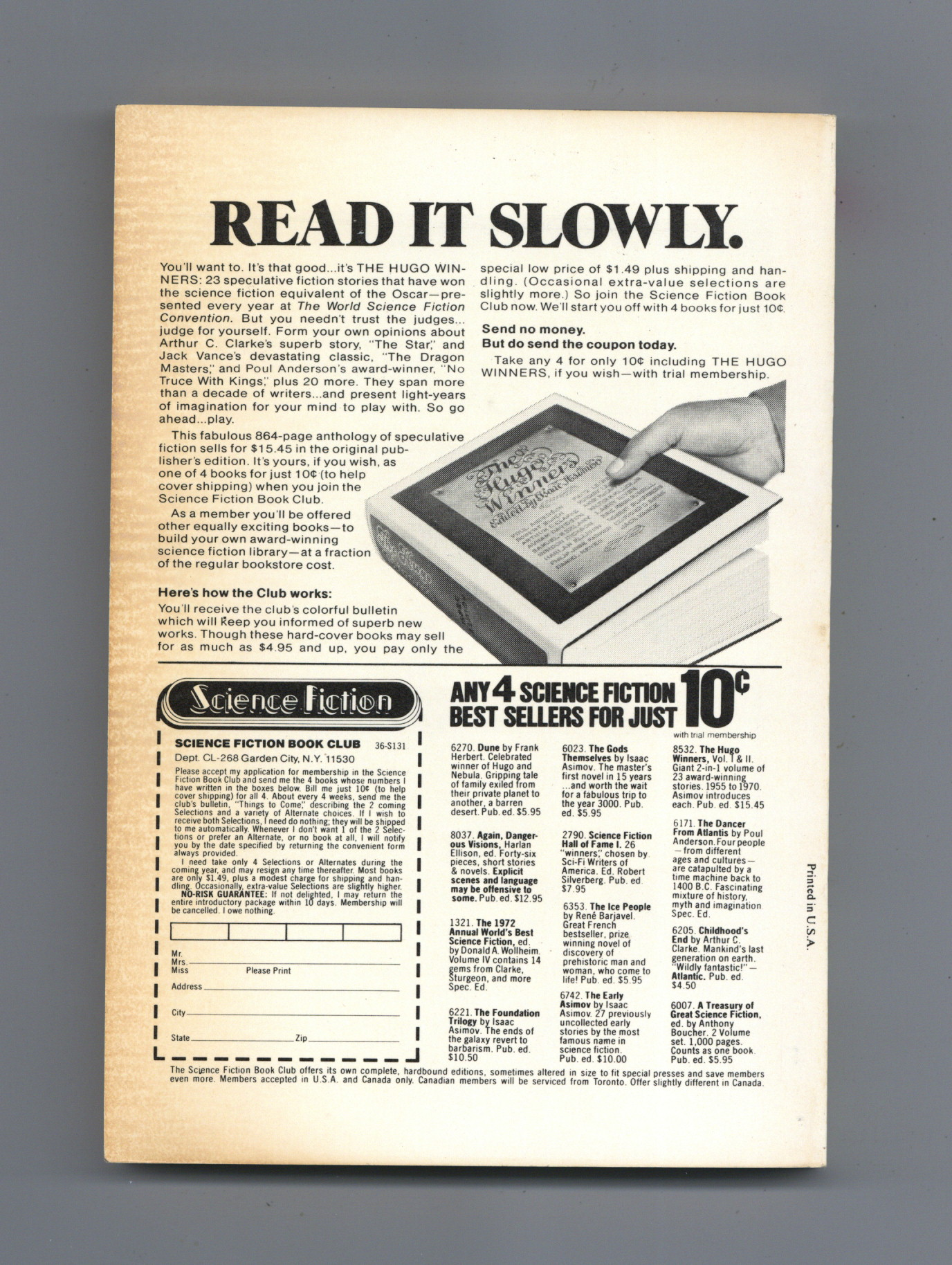 Published Apr 1973 by Quinn Publishing Co..$21.50March-April 1973. Volume 21, No. 10 (Whole No. 165). Cover by Brian Boyle. Science fiction stories by Frederik Pohl, Jack Williamson, Michael G. Coney, Colin Kapp, David Magil, Edward Wellen. 5.25-in. x 7.5-in.; black and white; 176 newsprint pages. Cover price $0.75.