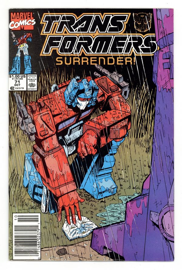 Tags: Transformers$36.50The Autobots surrender to the Decepticons in "Surrender!" Only a united Transformer force can hope to prevail against the planet-eating Unicron. Written by Simon Furman, with art by Andrew Wildman and Stephen Baskerville. Cover by Andrew Wildman. Cover price $1.00.