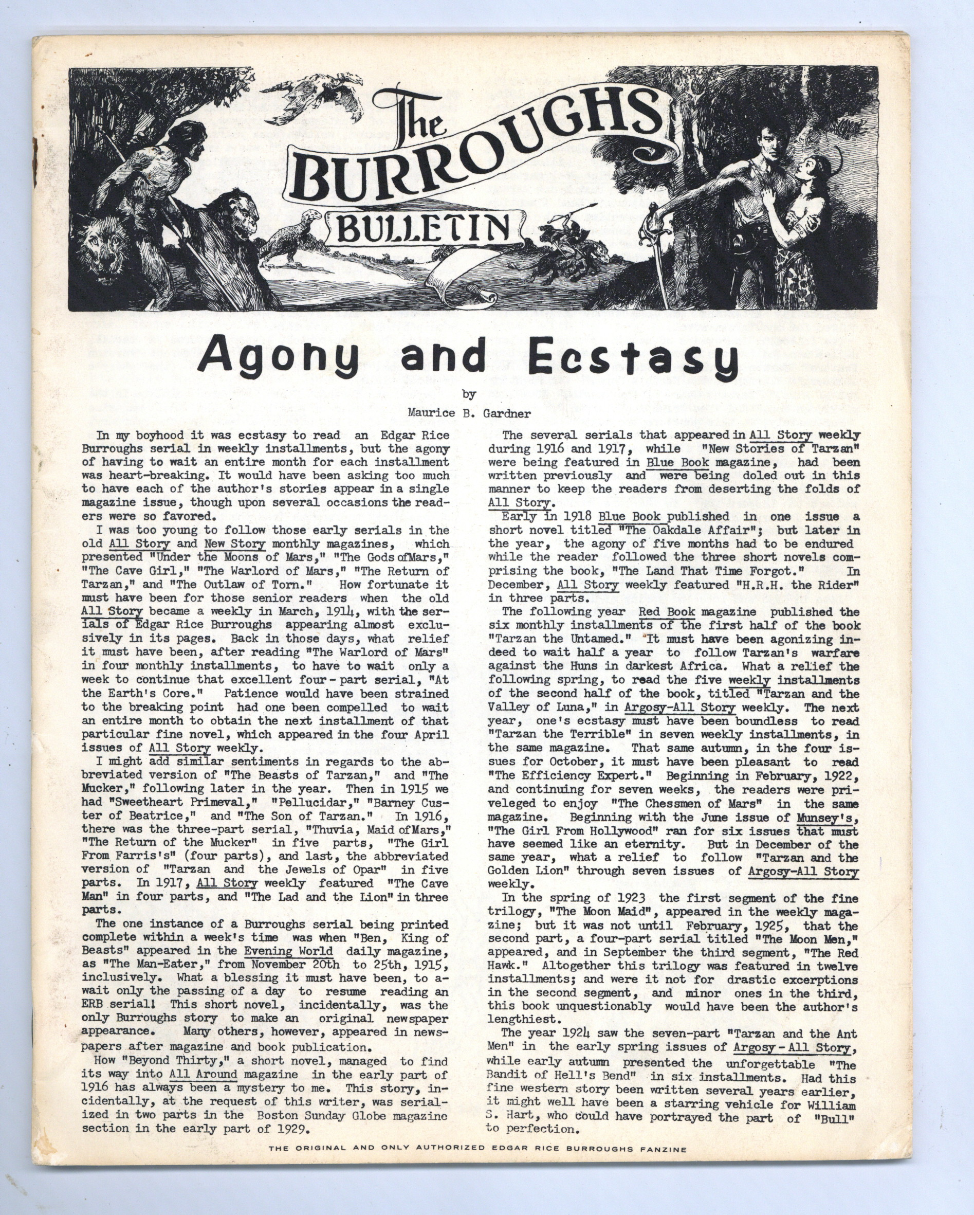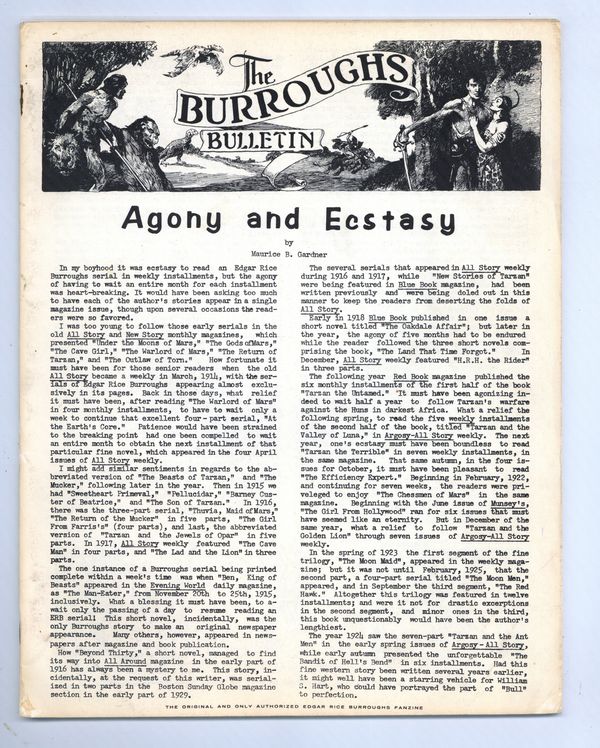 Issue #17 - 1967. Edgar Rice Burroughs Fanzine. "Agony and Ecstacy" by Maurice Gardner, "Misadventures of 'Henry' Tarzan" by Gabe Essoe, reproductions of ERB letters, "Study of the Omos Planetary System" by Frank Brueckel and more. Art by Roy Krenkel, Jeff Jones, Larry Hanks and John Celardo. 8 1/2-in. x 11-in., 40 pages, black and white.