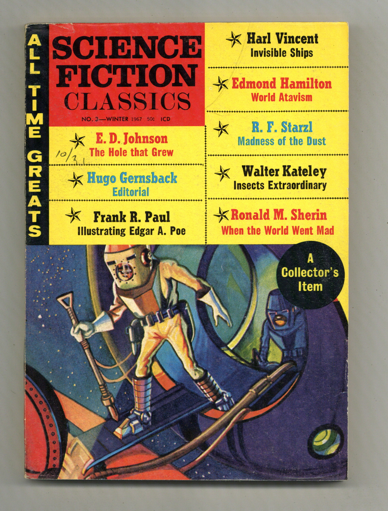 Published Dec 1967 by Magazine Productions.$24.00Winter 1967. Cover by Leo Morey. Stories by Harl Vincent, Edmond Hamilton, Walter Kateley, E. D. Johnson, Ronald M. Sherin, R. F. Starzl, David H. Keller. Illustrations by Frank R. Paul, Leo Morey, H. W. Wesso. 5-3/8 in. x 7-3/4 in.; black and white; 130 newsprint pages. Cover price $0.50.