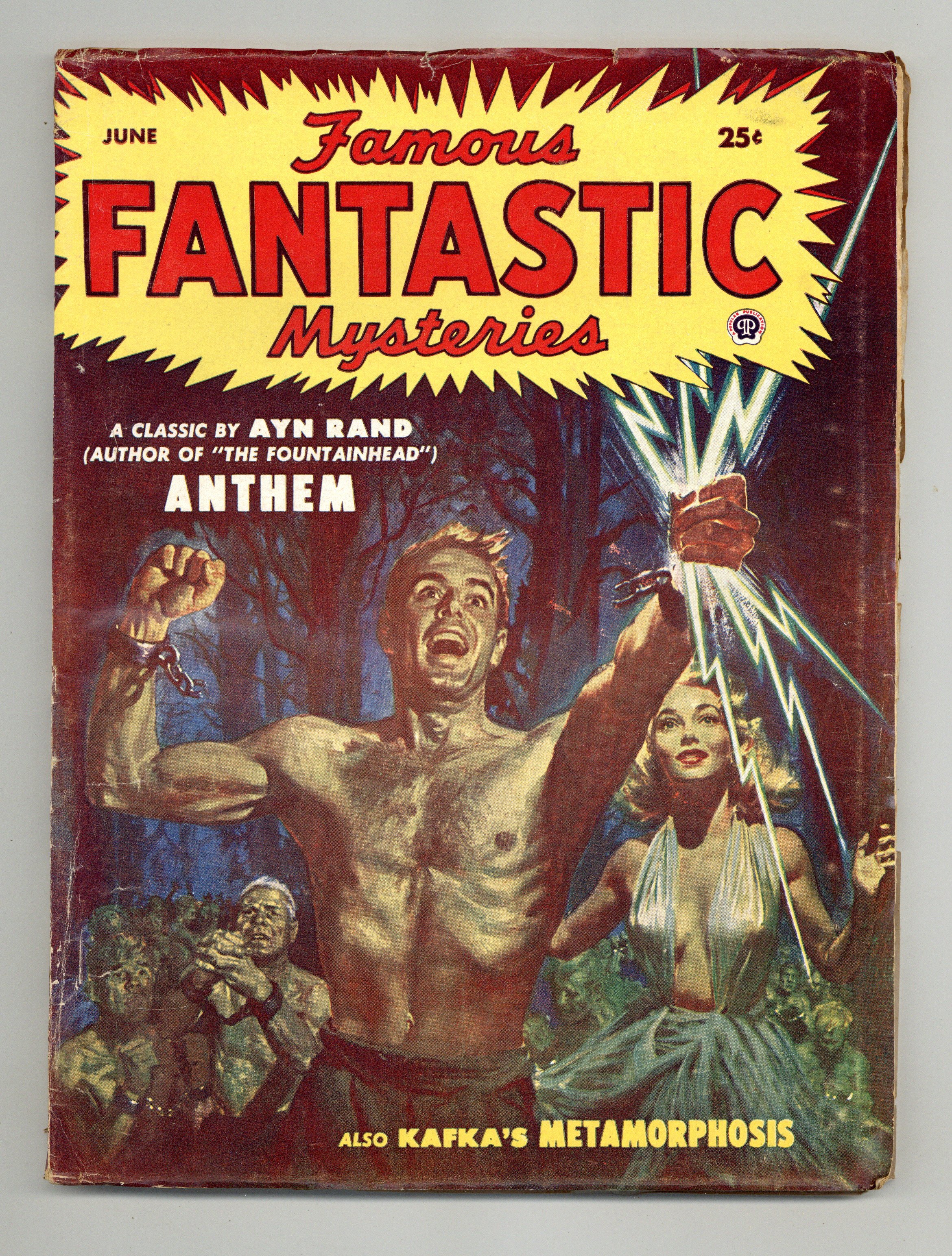 Vol. 14, No. 4 - June 1953. Author Ayn Rand's only appearance in pulps. June, 1953. Final Issue. Cover by Lawrence Stevens. "Anthem" by Ayn Rand (author's only appearance in pulps), "Worms of the Earth" by Robert E. Howard, "Pendulum" by Ray Bradbury & Henry Hasse, plus other science fiction and fantasy reprints by Franz Kafka, Benjamin Ferris, and Arthur Dekker Savage. Illustrations by Virgil Finlay, Lawrence Stevens, Hannes Bok. 6.75-in. x 9-in.; black and white; 116 newsprint pages. Published by Popular Publications Cover price $0.25.