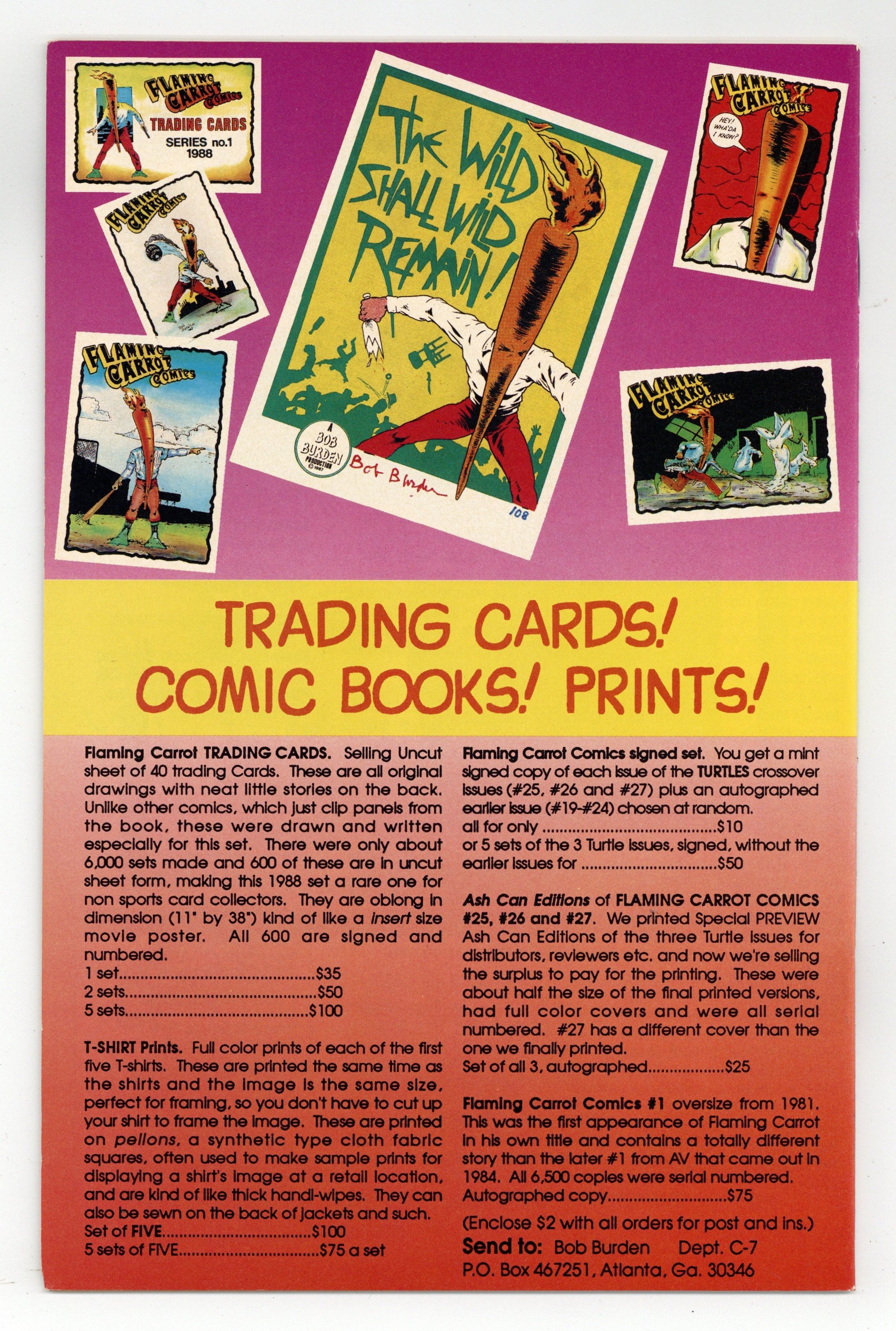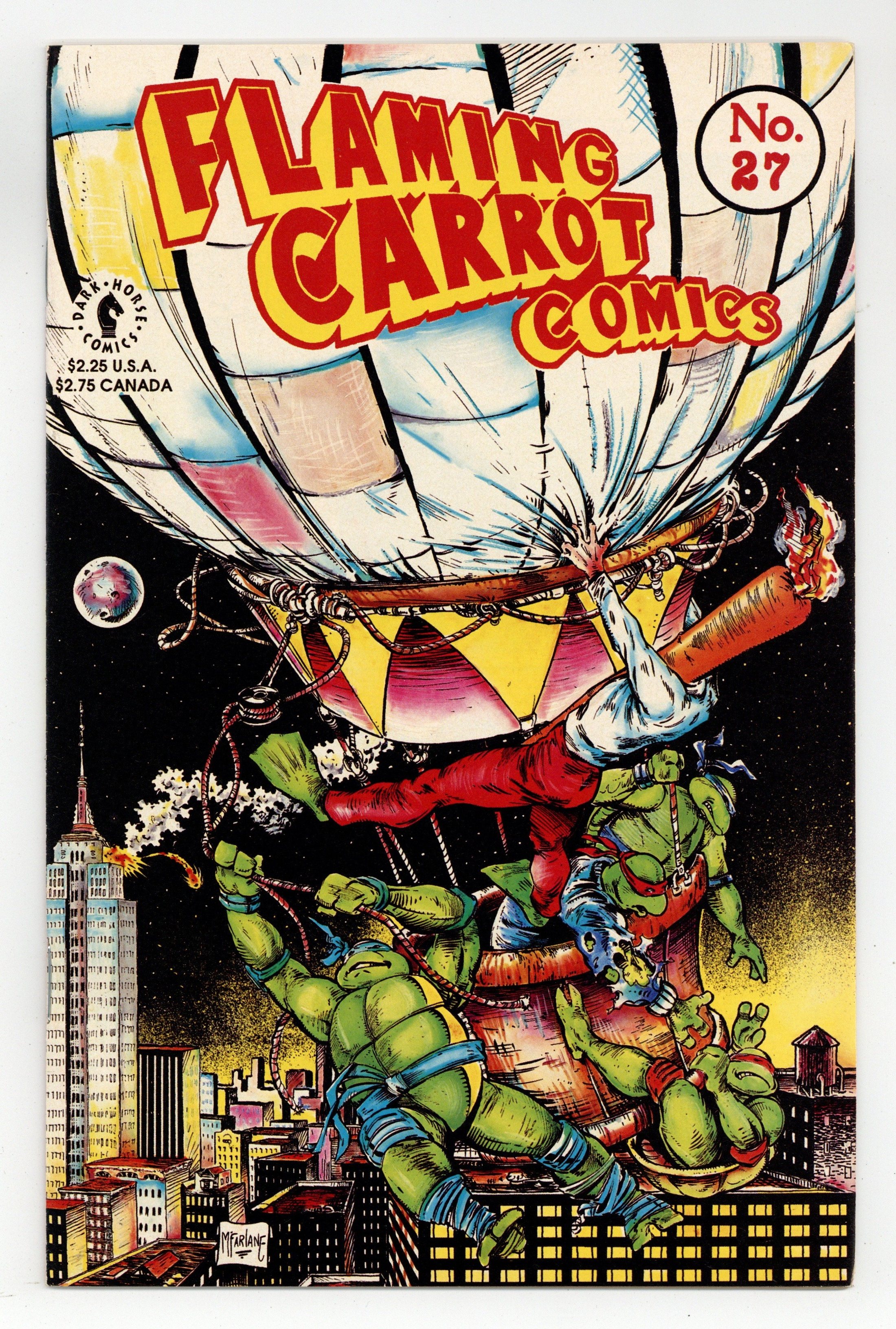 Flaming Carrot/TMNT Crossover: Part 3 -of 3 -Story and art by Bob Burden. Guest-starring the Teenage Mutant Ninja Turtles. "Fearless Umpire Killers," the three-part Flaming Carrot/Teenage Mutant Ninja Turtles crossover concludes! It's night in sleepy Mill City, but the streets are anything but quiet as the Flaming Carrot and his new-found pals the Teenage Mutant Ninja Turtles take on a legion of renegade umpires! 32 pages, B&W. Cover price $2.25.