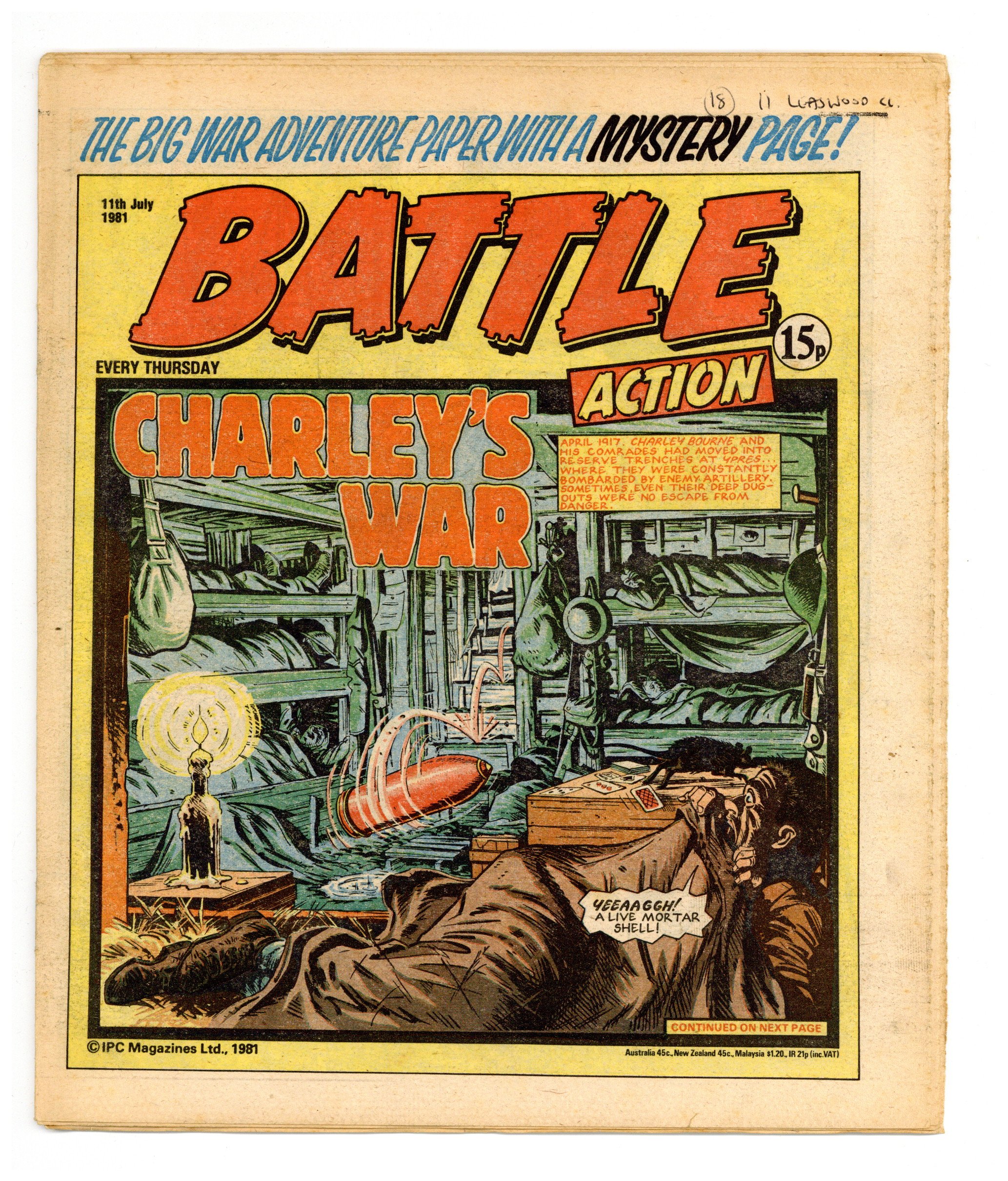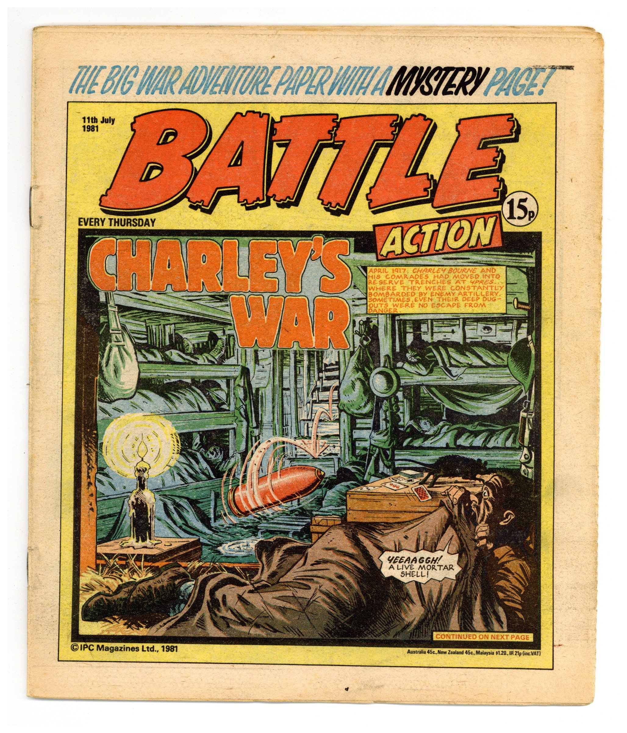 July 11, 1981. Published by IPC Magazines, Ltd. in the U.K. "Tough action war stories every week!" Combined with Valiant (also an IPC publication). 9 x 11 in.; black and white (color centerspread); 32 pages; 15p cover price. NOTE: Title changes to Battle (1981 IPC Magazines) UK.