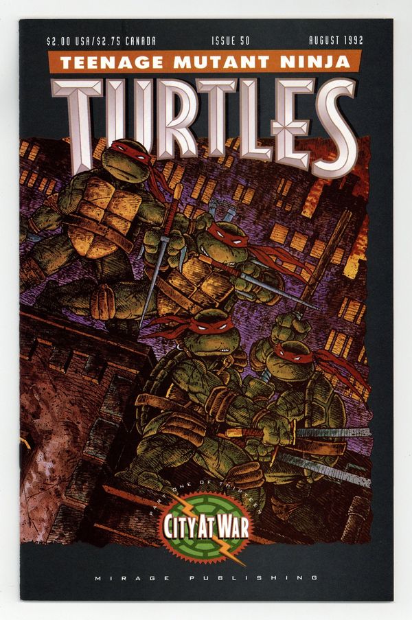 Published Aug 1992 by Mirage Studios.$29.00City At War, Part 1. After three years, creators Kevin Eastman and Peter Laird resume full creative duties on the title that made them famous with a multi-chapter epic. Story, art and cover by Kevin Eastman and Peter Laird. Todd McFarlane and Walt Simonson pin-ups. Black and white; 44 pages. Cover price $2.00. Cover price $2.00.