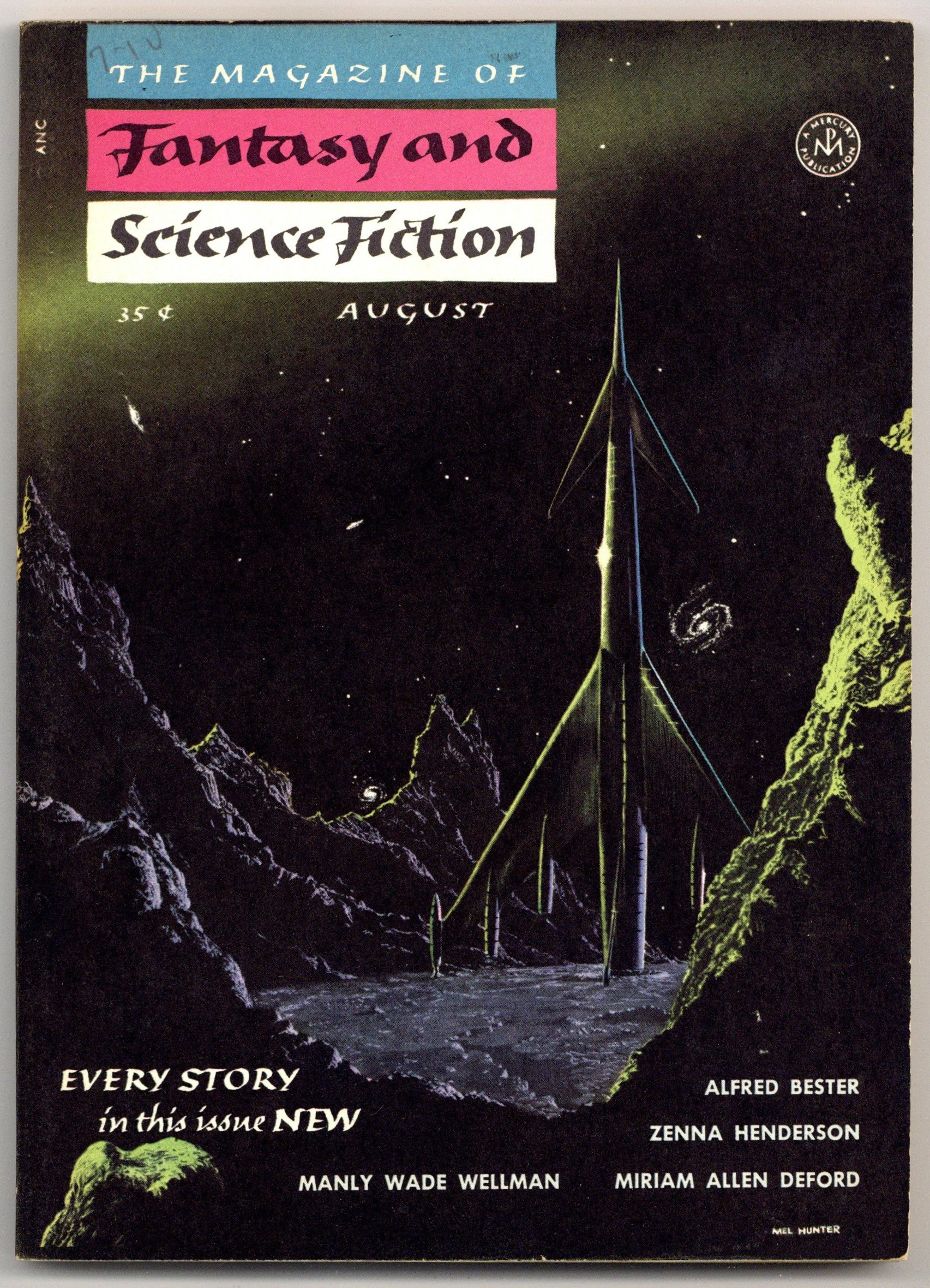 Tags: Anthology / CollectionPublished Aug 1954 by Mercury Publications.$8.40August 1954. Wraparound cover by Mel Hunter. "The Quadriopticon" by Charles Beaumont, plus more fantasy and science fiction stories by Alfred Bester, Arthur Porges, Zenna Henderson, Miriam Allen DeFord, Richard Brookbank, Kay Rogers, Doris P. Buck, and Manly Wade Wellman. Softcover. 5.5-in. x 7.5-in. 128 newsprint pages, black and white (all text). Cover price $0.35.