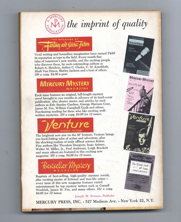 Tags: Anthology / CollectionPublished Jul 1958 by Mercury Publications.$18.00Cover by Barry Waldman. Science fiction and fantasy stories by Gordon R. Dickson, Kit Reed, Jules Verne, Mildred Clingerman, Ron Goulart, Issac Asimov, Roy Vickers, Stephen Barr, Michael Fessier and C. M. Kornbluth. Softcover, 5.5-in., x 7.5-in., 130 pages, black and white (all text) Cover price $0.35.