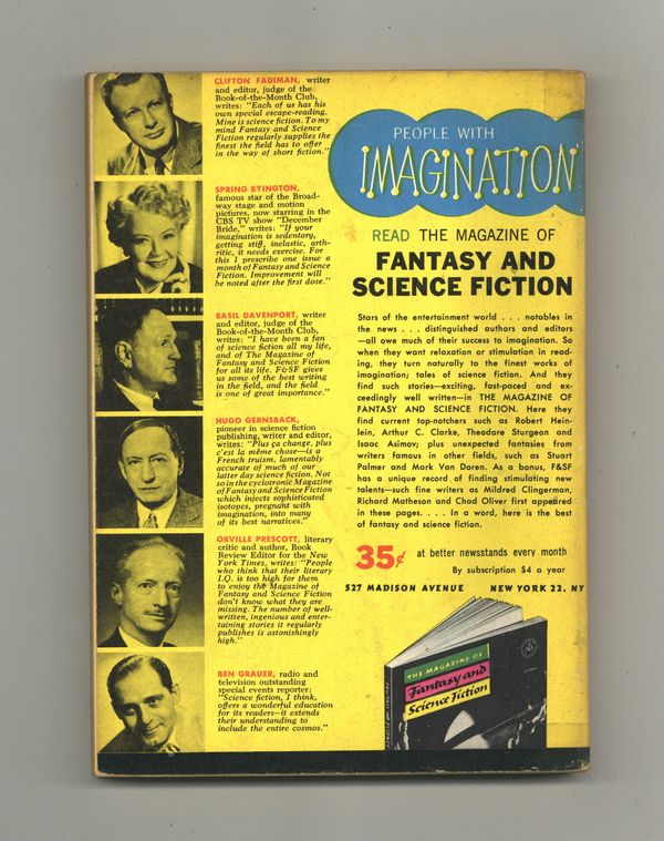 Tags: Anthology / CollectionPublished Sep 1958 by Mercury Publications.$5.00Cover by Ed Emshwiller. "Have Spacesuit - Will Travel" 2/3 by Robert A. Heinlein and "That Hellhound Train" by Robert Bloch, plus more science fiction and fantasy stories by William C. Boyd, R. M. McKenna, John Collier, Jane Roberts, William Marsh and Wright Morris. Softcover, 5.5-in., x 7.5-in., 130 pages, black and white (all text) Cover price $0.35.
