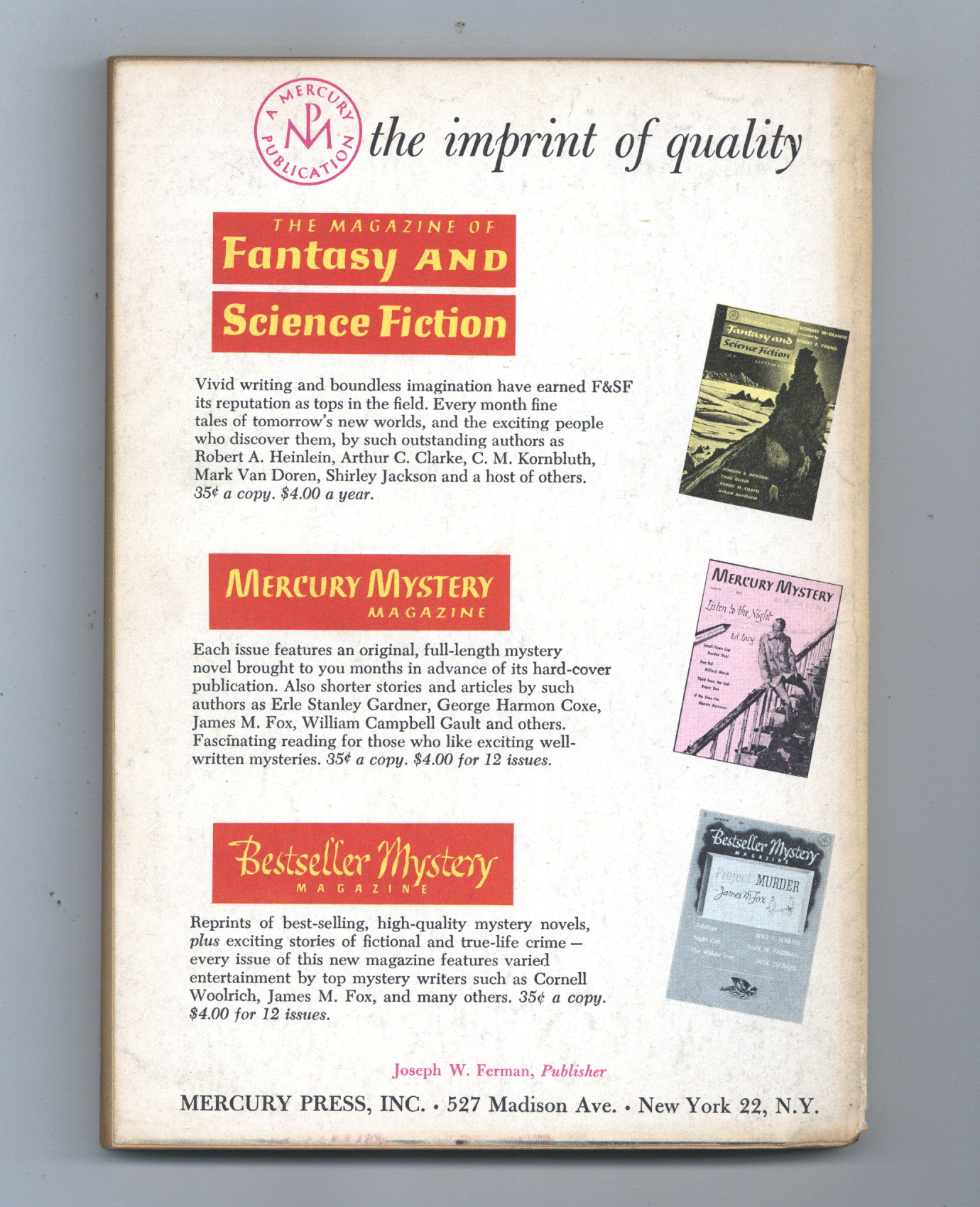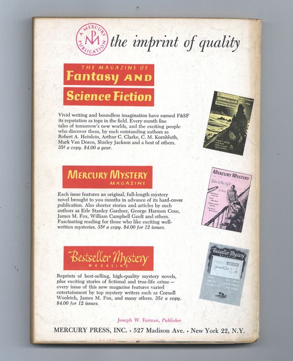 Tags: Anthology / CollectionPublished Nov 1958 by Mercury Publications.$24.00Cover by John Pederson. Science fiction and fantasy stories by Kem Bennett, Michael Fessier, Issac Asimov, A. Bertram Chandler, Avram Davidson, Poul Anderson, Jack Williamson, Robert Arthur, Carol Emshwiller, P. Schuyler Miller and Manly Wade Wellman. Softcover, 5.5-in., x 7.5-in., 132 pages, black and white (all text) Cover price $0.35.
