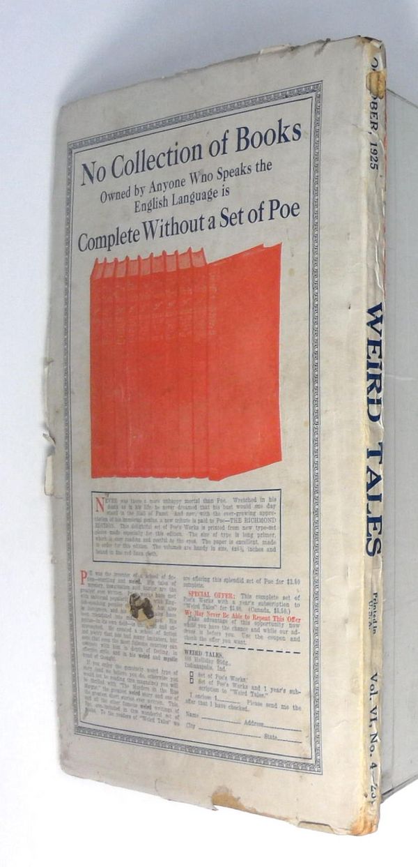 Tags: Anthology / CollectionPublished Oct 1925 by Weird Tales.$925.00- Paper: Light tan to off white