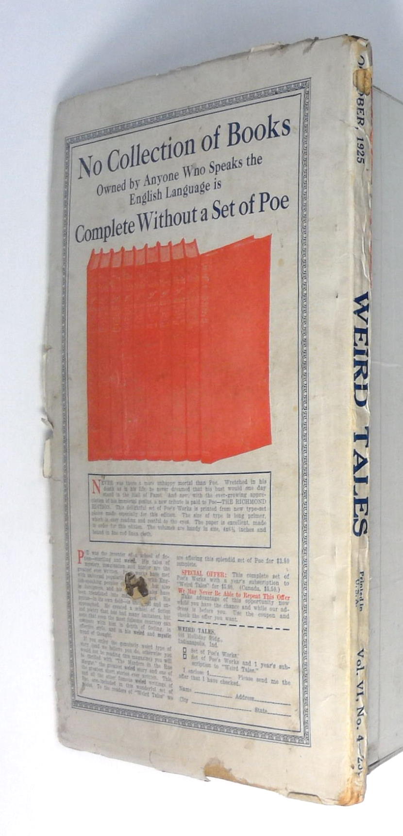 Volume 6, Issue 4 - October 1925. Edited by Farnsworth Wright. Horror and Fantasy stories in the pulp style. 6.75-in. x 10-in.; 128 newsprint pages, text (with B&W illustrations). Cover price $0.25.