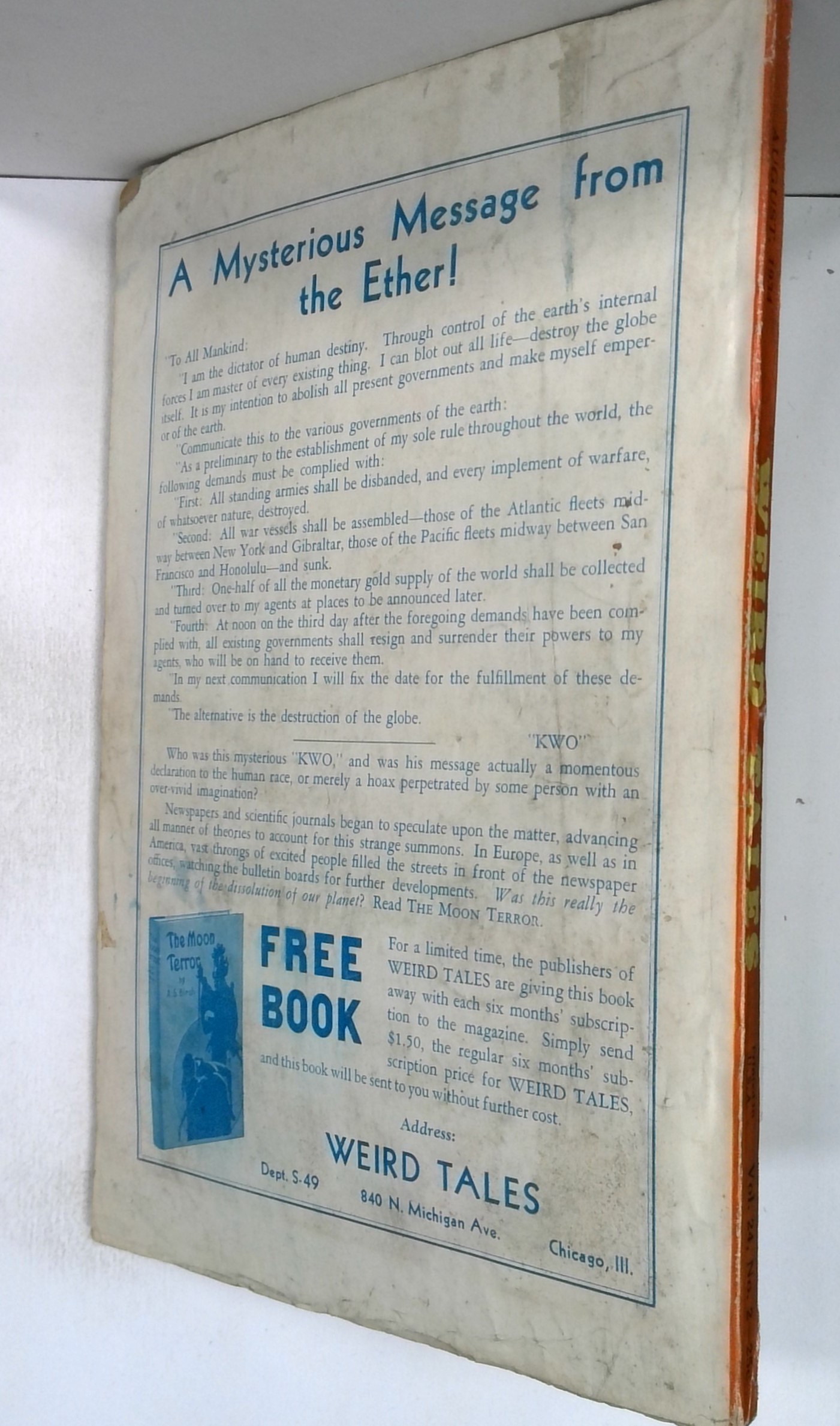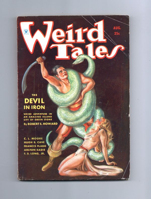 Tags: Anthology / CollectionPublished Aug 1934 by Weird Tales.$500.00- Water damage: Moderate. Staple rust: Slight.