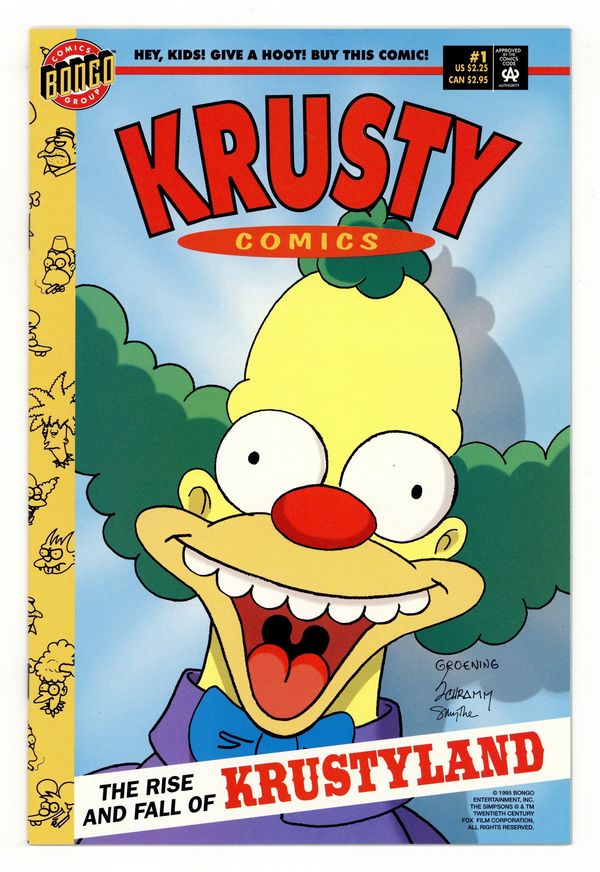 $11.50"Rise and Fall of Krustyland," Part 1 of 3. Based on The Simpsons television series, this first issue of Krusty the Clown finds the titular character opening an amusement park and hiring Bart as its supervisor. Unfortunately, the land is cursed. Also includes "Double Date," in which Krusty and Mr. Teeny go out on the town. Script by Jamie Angell, pencils by Phil Ortiz and Shaun Cashman, inks by Cary Schramm and Mili Smythe. Cover by Schramm and Smythe. Cover price $2.25.