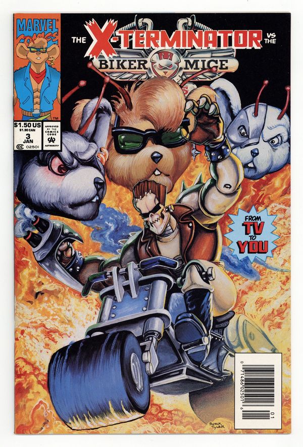 $18.00The origin of the Biker Mice reaches its explosive climax, as told by TV series creator Rick Ungar and writer Bob Forward. Dr. Karbunkle introduces the terrifying X-Terminator, an ultra-deadly cyborg determined to destroy the trio of hog riding rodents. Written by Bob Forward. Art by Rurik Tyler and Gary Fields. Painted cover by Rurik Tyler. Cover price $1.50.