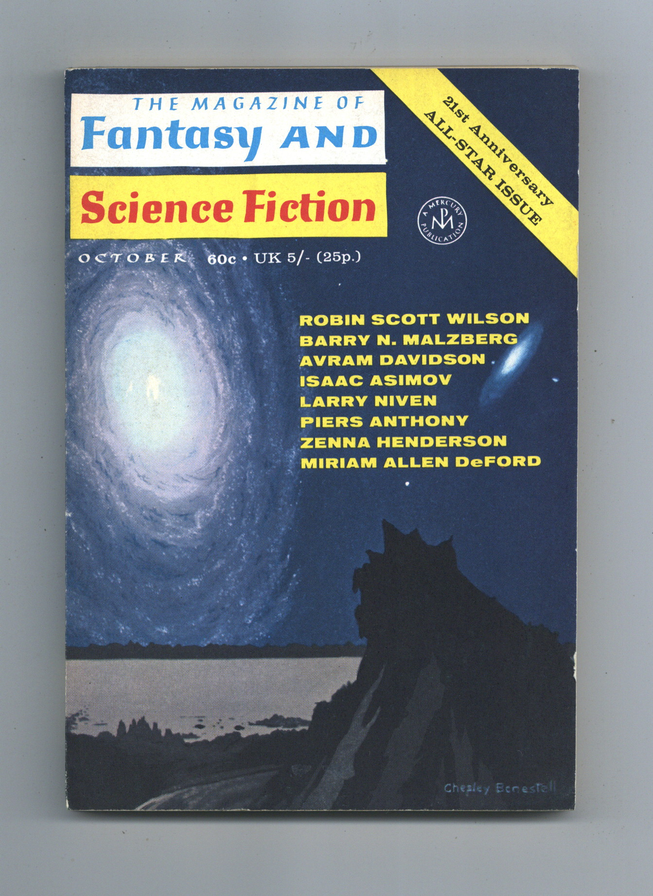 October 1970. Whole number 233. Cover by Chesley Bonestall. Science fiction stories by Zenna Henderson, Neil Shapiro, Robin Scott Wilson, Avram Davidson, Barry N. Malzberg, Miriam Allen Deford, Piers Anthony and Larry Niven. Softcover, 5-in. x 7-in., 130 newsprint pages, B&W. Cover price $0.60.