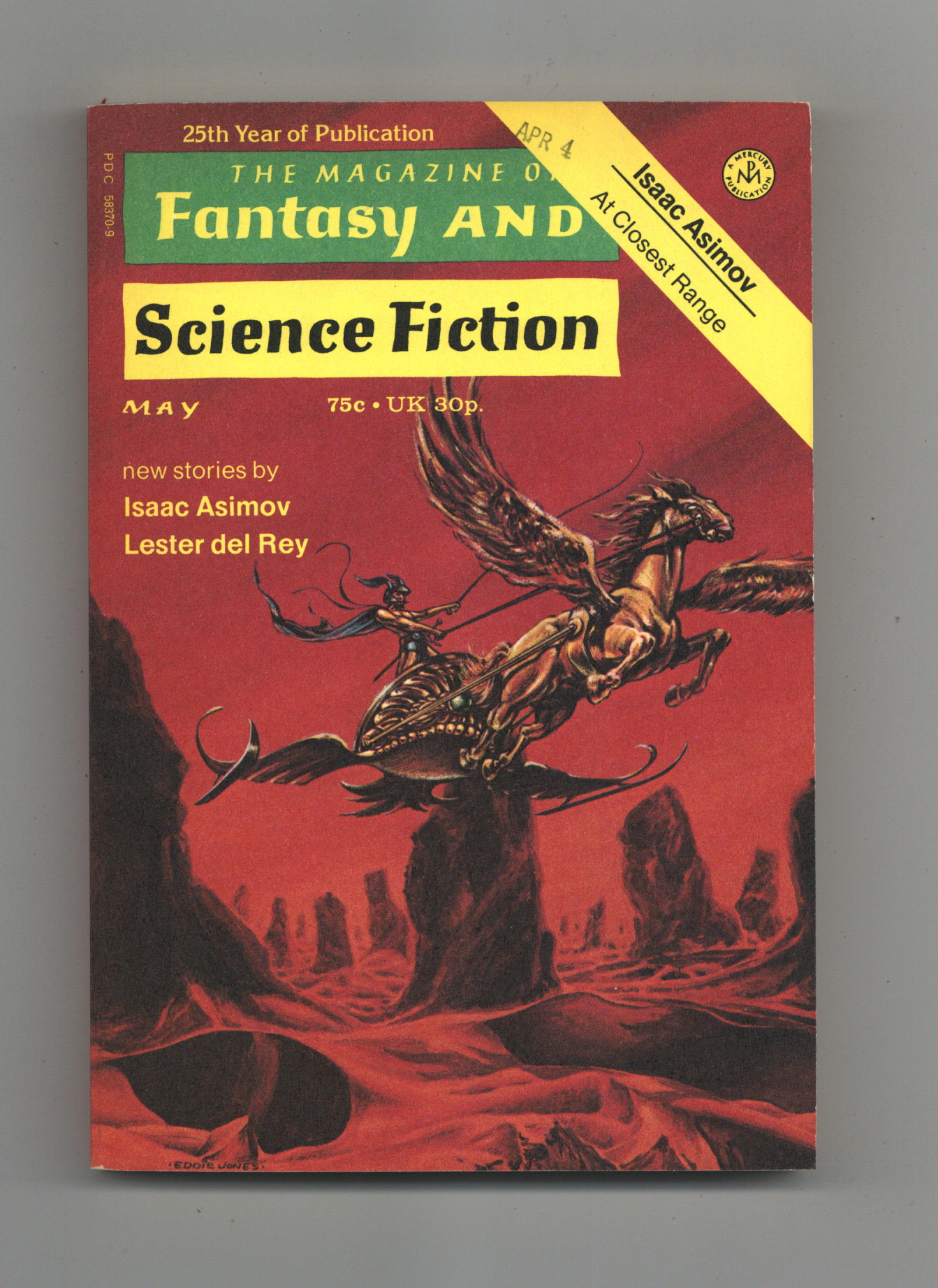 May 1974. Whole number 276. Cover by Eddie Jones. Fantasy and science fiction stories by Isaac Asimov, Arthur Jean Cox, Phyllis Gotlieb, Phyllis Maclennan, Lester Del Rey, Robert Borski and C. L. Grant. 5 1/2-in. x 7 1/2-in., 162 pages, black and white (text). Cover price $0.75.