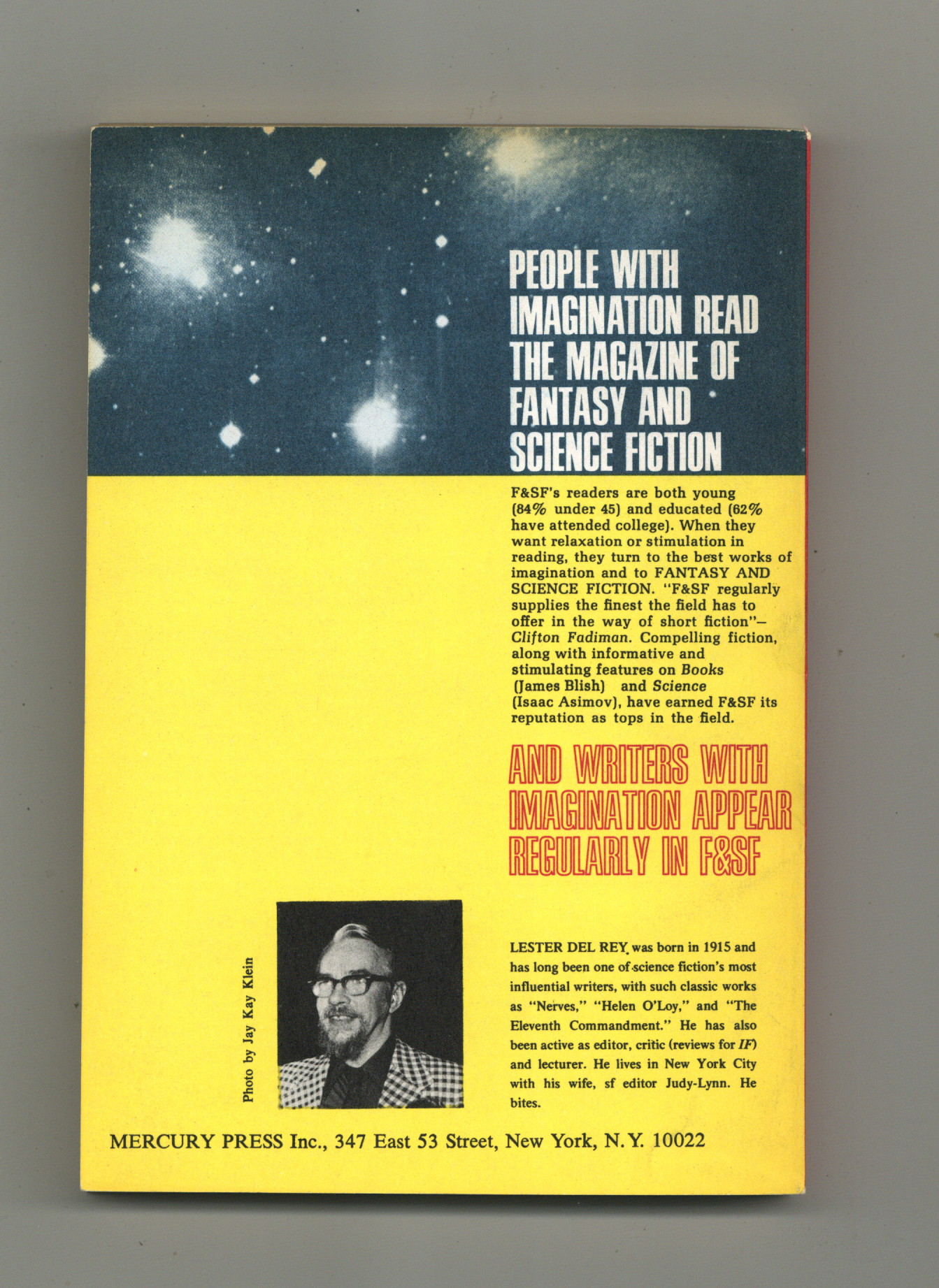Tags: Anthology / CollectionPublished May 1974 by Mercury Publications.$28.00May 1974. Whole number 276. Cover by Eddie Jones. Fantasy and science fiction stories by Isaac Asimov, Arthur Jean Cox, Phyllis Gotlieb, Phyllis Maclennan, Lester Del Rey, Robert Borski and C. L. Grant. 5 1/2-in. x 7 1/2-in., 162 pages, black and white (text). Cover price $0.75.