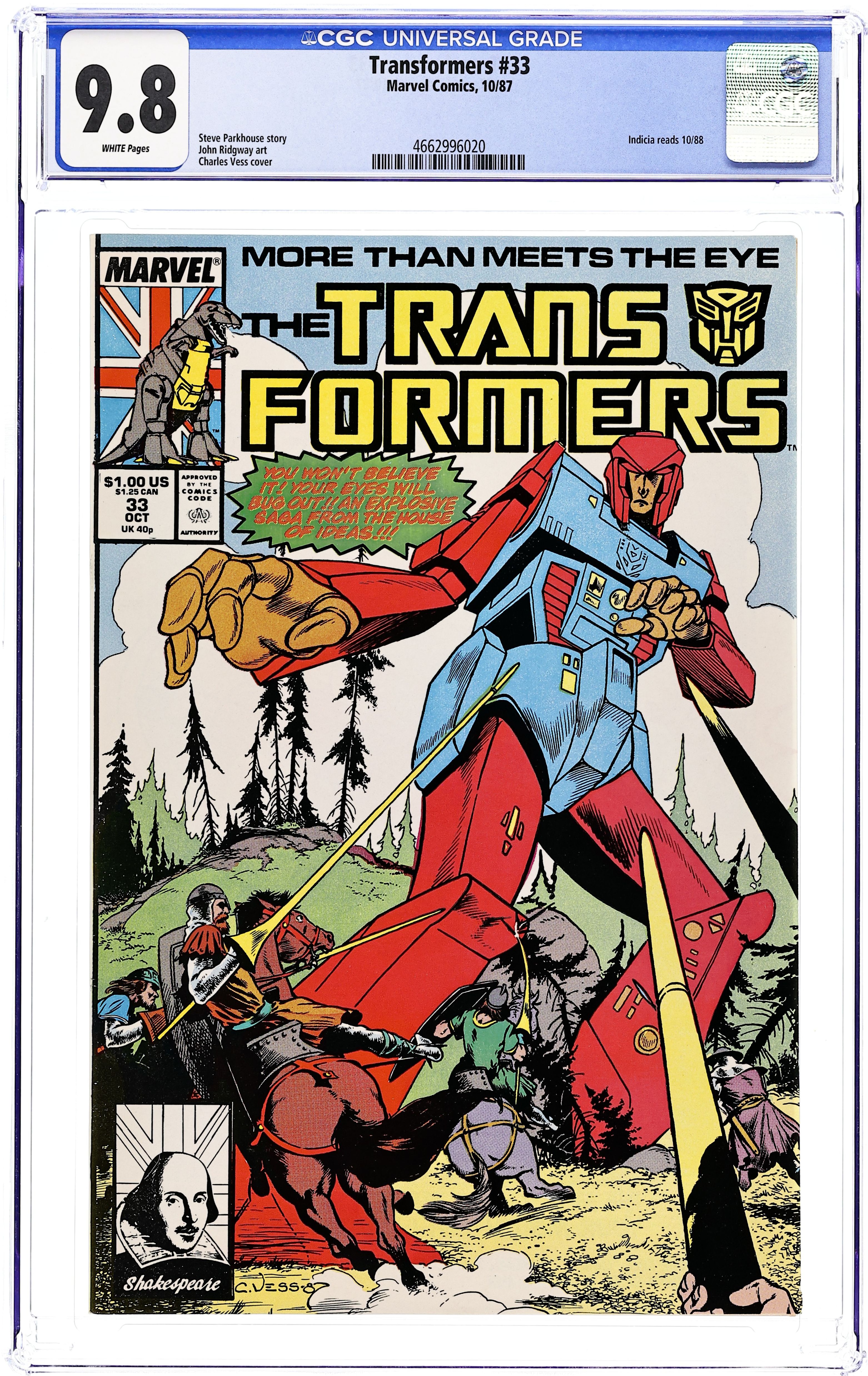 Charles Vess cover. Early comic book version of the famous "transforming" robots. This issue features a story from the British version of the Transformers comic book. A young boy, Sammy Harker, stumbles across one of the Autobots near the area of Stangham Castle which leads into an ancient legend of a warrior known as the "Man of Iron." Script by Steve Parkhouse and art by John Ridgway. Cover price $1.00.