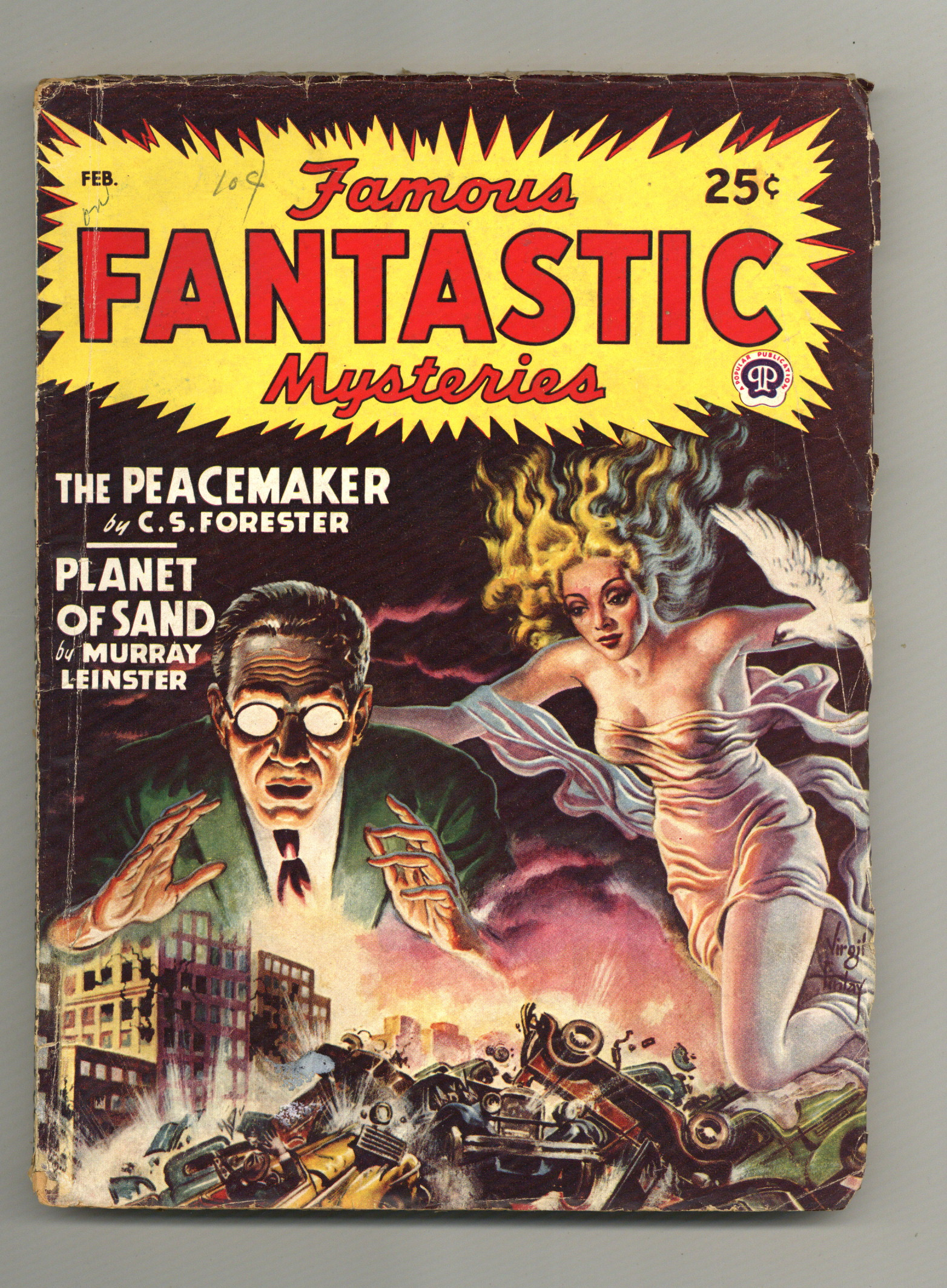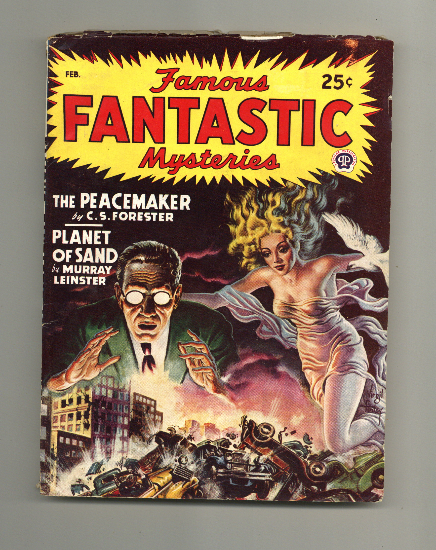Published Feb 1948 by Frank A. Munsey.$6.80Volume 9, Issue 3 - February, 1948. Cover by Virgil Finlay. "The Peacemaker" by C. S. Forester, "Planet of Sand" by Murray Leinster, and "The Lonesome Place" by August Derleth. Illustrations by Lawrence. 7-in. x 9 1/2-in.; black and white; 132 newsprint pages. Published by Popular Publications Cover price $0.25.