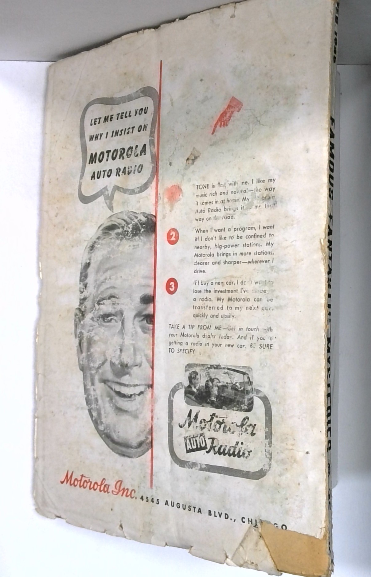 - Front cover detached 20%. Back cover detached 10%. Water damage: Moderate. Staple rust: Slight.